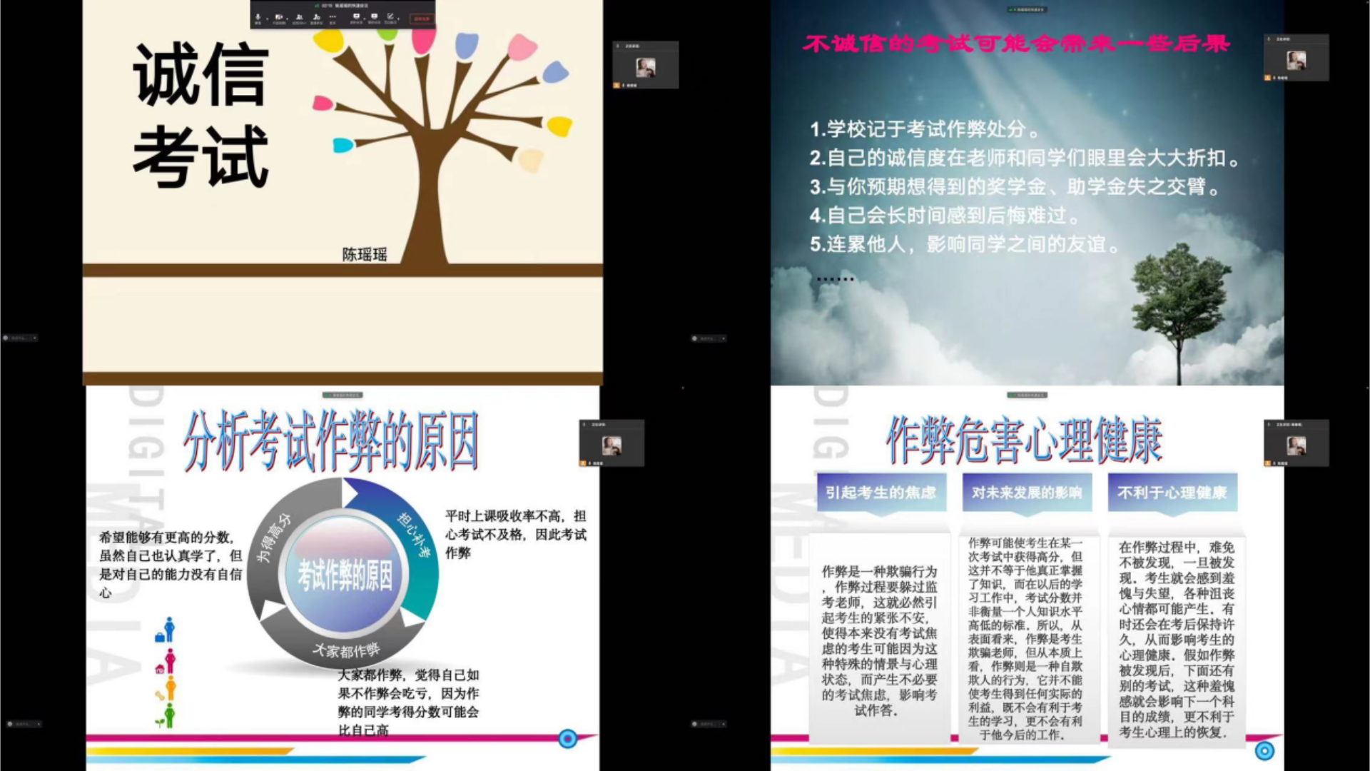 班会上,辅导员陈瑶瑶提出“以诚立信 以信应试”的观念,强调诚信考试的重要性,明确诚信的准则,让同学们自觉遵守考试纪律,切忌考试作弊,并告知同学们违纪与作弊的处理方法,以此警示同学们诚信考试。