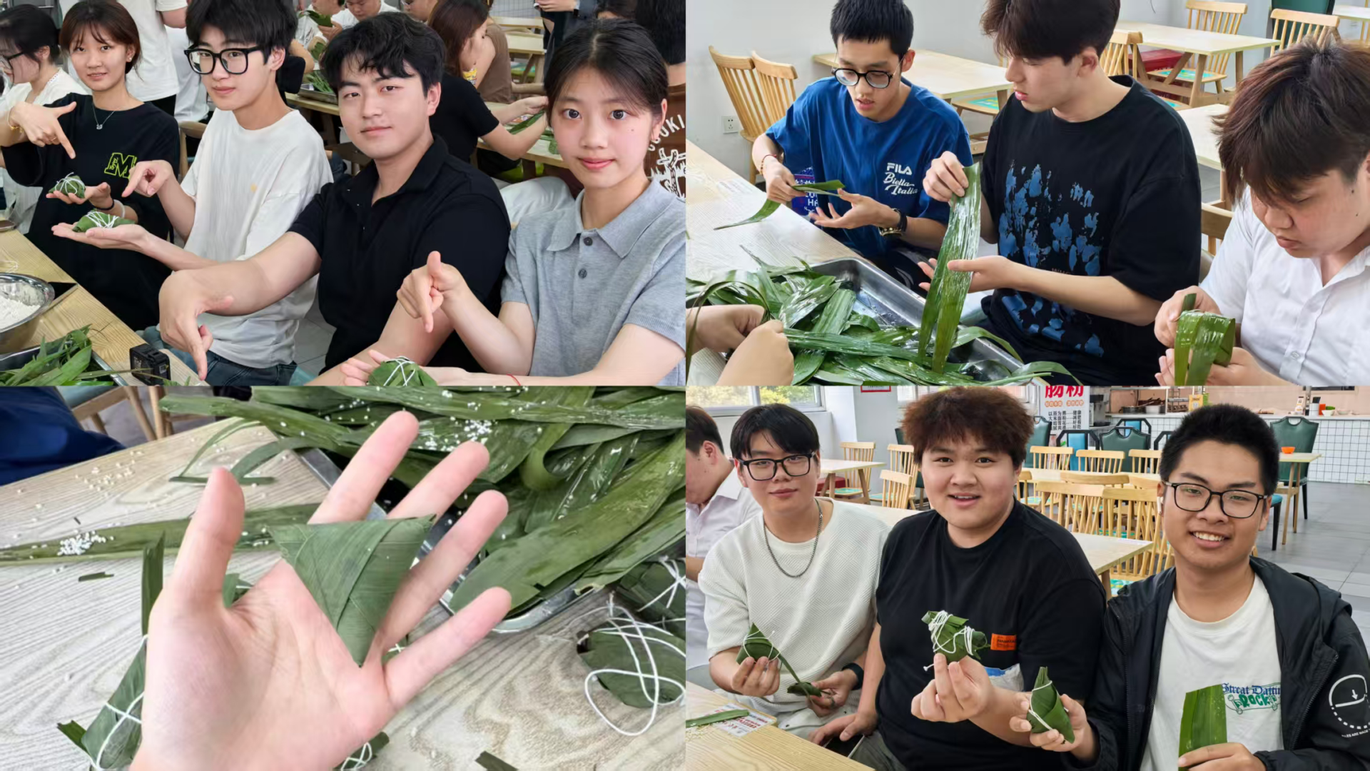5月29日下午,同学们在学院六食堂齐聚,现场亲手包粽子,过端午共庆佳节。活动现场布置得充满节日氛围,粽叶的清香与欢快的笑声交织在一起,格外热闹。包粽子环节是本次活动的重头戏。桌子上整齐地摆放着糯米、五花肉、粽叶、棉线等材料。经验丰富的同学主动当起“老师”,向初次尝试的同学们耐心传授包粽子的技巧。只见他们先将粽叶卷成漏斗状,放入糯米和馅料,再用灵巧的双手将粽叶包裹严实,最后用棉线缠绕系紧,一个个小巧玲珑、饱满紧实的粽子便成型了。在“老师”们的指导下,大家逐渐掌握了要领,从一开始的手忙脚乱,到后来也能包出有模有样的粽子,现场一片欢声笑语,其乐融融。