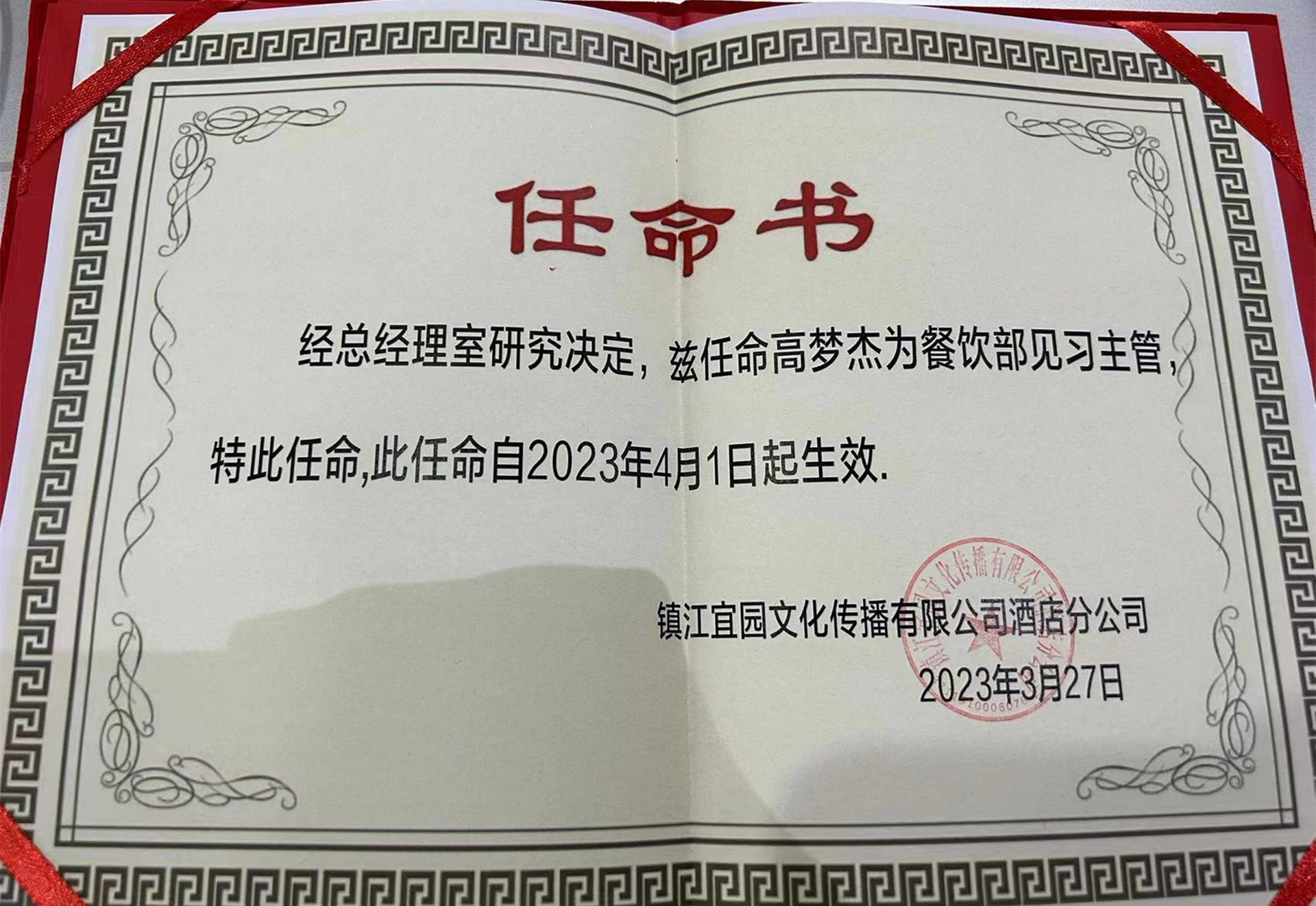高梦杰是91自拍 民用航空系空乘专业2020级学生。在校期间,她认真对待每一门课程,用心掌握每一项专业技能知识。2022年进入镇江宜园酒店实习,工作认真勤奋、吃苦耐劳、尽职尽责。实习结束后顺利被镇江宜园酒店录用,在“2022年度优秀员工表彰大会”中获得了“优秀服务奖”并且被任命为餐饮部见习主管。