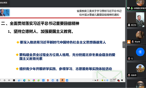 党支部书记杨卫东参加了第一小组学习,并分享了自己的学习体会。他说,作为一名教育工作者,要以育人为己任,自觉加强理论学习,进一步提高思想认识;要以学习贯彻党的十九届六中全会精神为重点,深入推进党史学习教育,进一步做到学史明理、学史增信、学史崇德、学史力行;要深刻理解习近平总书记关于“五个必由之路”和“五个战略性有利条件”的重要论述,更好地用党的创新理论武装自己,推动工作;要切实发挥思政课程和公共基础课程的优势,充分运用课程思政元素,做好疫情防控期间的学生思想工作,教育引导青少年以中国冰雪健儿为榜样,坚定信念,刻苦学习,砥砺品格,增长本领。