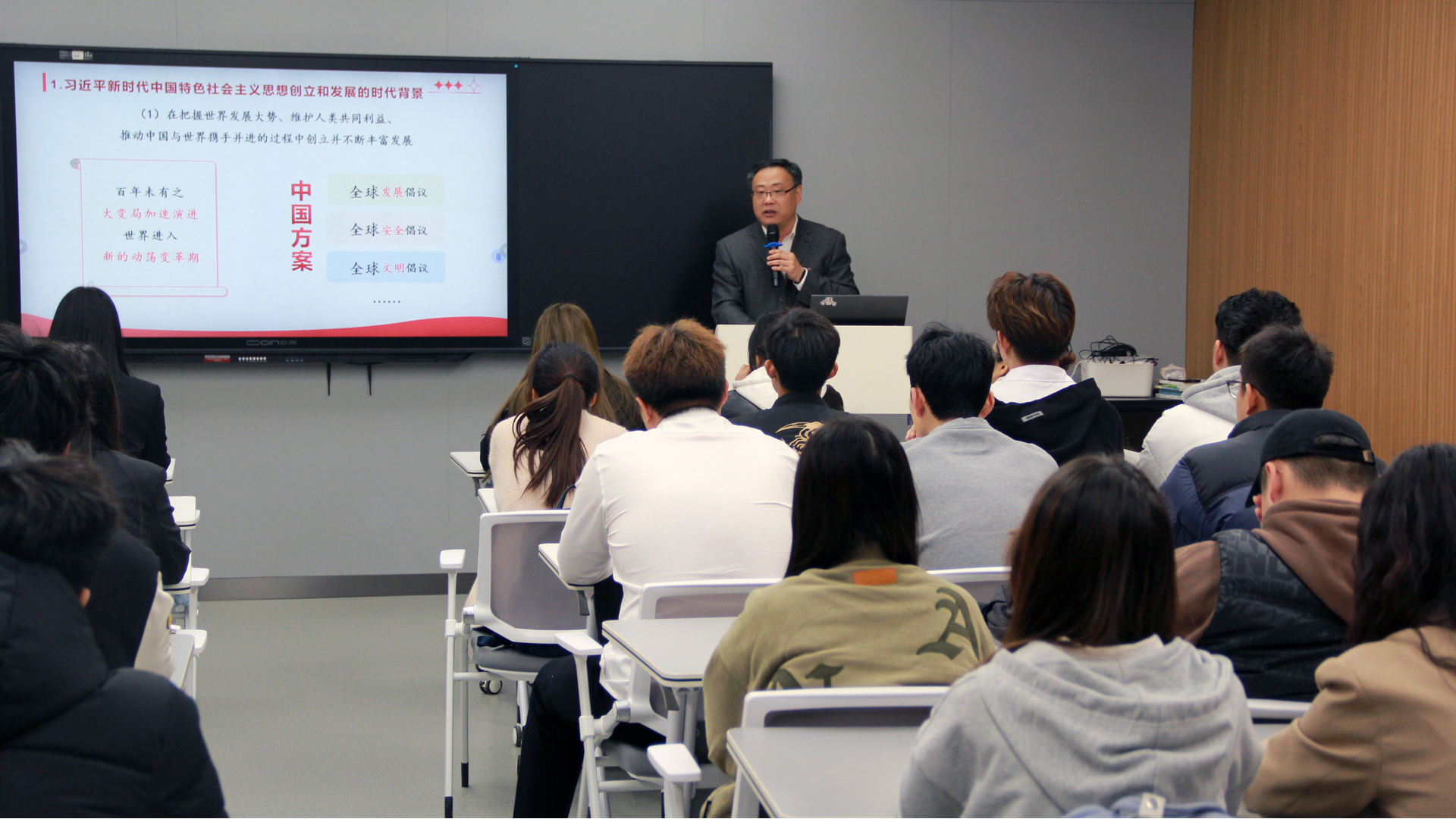 11月29日,思政教研部主任杨卫东为艺术设计与建筑工程系的团学干部作了一场专题辅导。他以开辟马克思主义中国化时代化新境界为题,和同学们一起学习了习近平新时代中国特色社会主义思想创立的时代背景、主要内容和科学体系、世界观和方法论,并结合学生骨干的日常学习生活工作分享了自己的学习体会,使同学们对习近平新时代中国特色社会主义思想科学体系、鲜明的实践品格以及贯穿这一思想的立场观点方法有了更进一步理解。