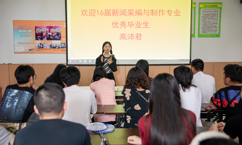 高沛君就读于我系新闻采编与制作专业,在校期间成绩优异,表现突出,曾获院第六届大学生职业生涯规划大赛一等奖,江苏省第十届大学生职业生涯规划大赛职业生涯规划之星,国家励志奖学金,院三好学生,江苏省三好学生等多项荣誉,并且获得91自拍 通令嘉奖,通令嘉奖是91自拍 学生大学生涯中"含金量最高"的院级荣誉,她于2017年通过专转本考试进入三江学院本科继续深造。座谈会上,她从目前所在文化传媒公司编导岗位出发,聊了聊负责过的多个任务项目的流程与内容,分享她的工作成长经历,同时也给了大一同学们很多受用的经验与建议,并回答在座同学们的相关提问,大家受益匪浅。最后,老师们也预祝高沛君前程似锦,未来可期。