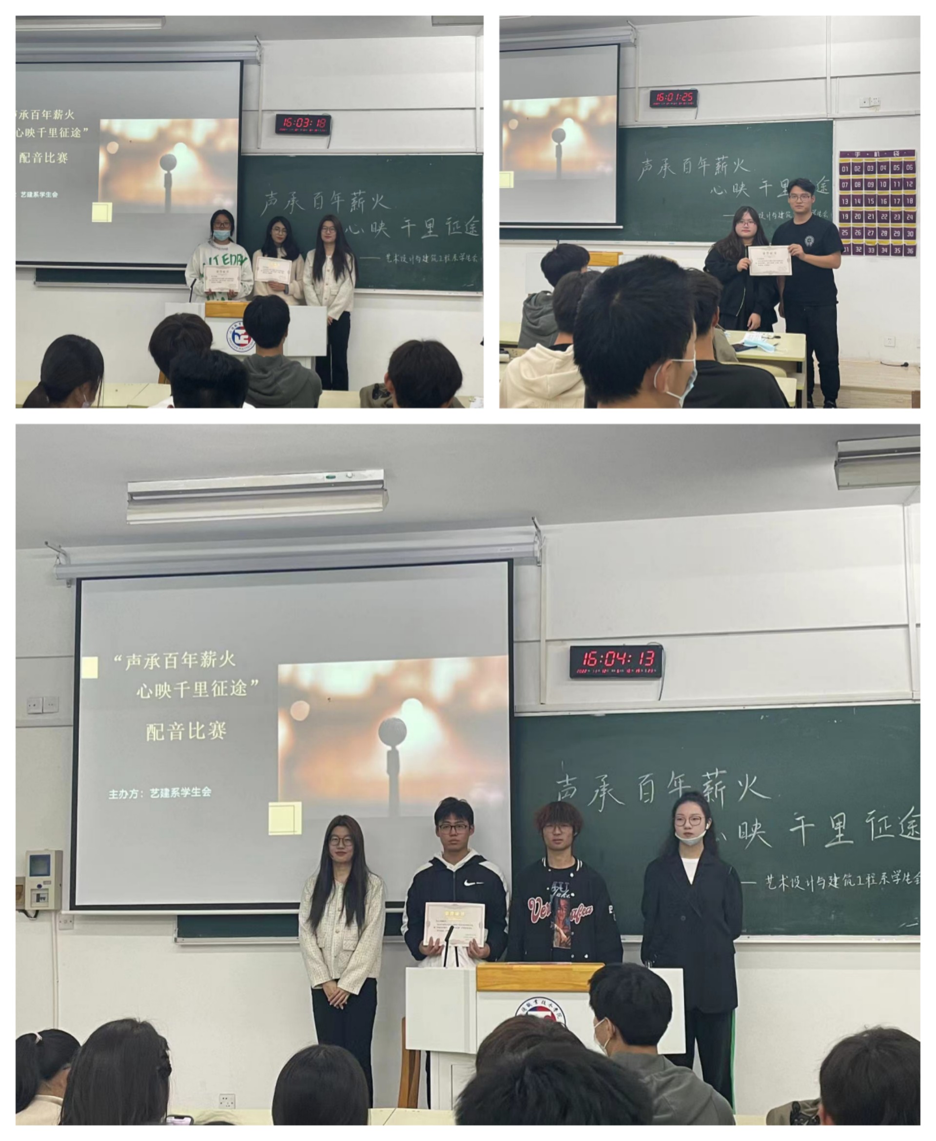 活动开始前,各位选手陆续入场抽取自己的号码牌,观众评委也逐一就坐。在本次精彩的活动中,有爱国主义、反校园暴力等一系列精彩主题的配音片段精选,参赛同学们语调自然,表达生动,充分将观众及评委带入角色,使人身临其境,不仅让比赛对手都为之震撼,也让评委们连连称赞,教室里时常想起雷鸣般的掌声。经过评委们认真讨论,最终评分最高作品王舒馨同学的《四十九日祭》荣获一等奖,众望所归;周梓琪同学带来的《悲伤逆流成河》荣获二等奖,唤醒听众对校园暴力的痛恶;钱心蕊同学的《辛亥革命》,戴佳琪同学的《白蛇·起源》,刘语譞同学的《角色混剪音频》这三位同学的作品并列三等奖,其余组为优秀奖。