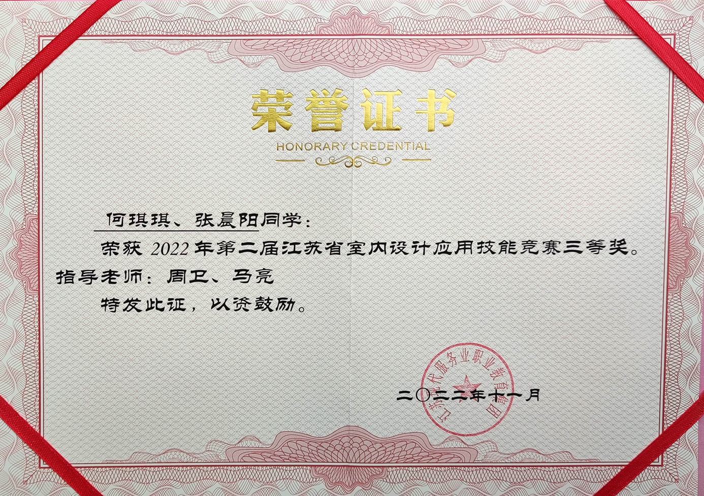 11月25日至26日,由江苏省高等教育学会指导,江苏现代服务业职业教育集团、江苏经贸职业技术学院主办的“2022年第二届江苏省室内设计应用技能竞赛”成功举办,全省高职院校11支代表队参赛,91自拍 代表队获竞赛三等奖。