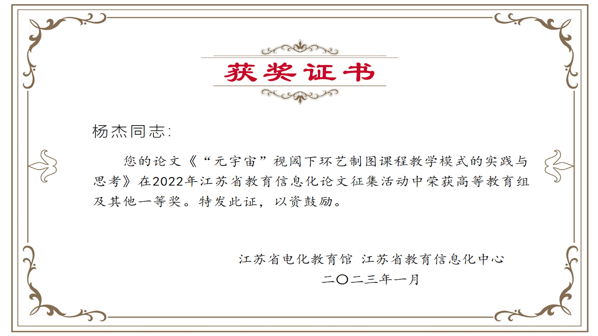 近日,2022年度全国教育技术论文活动公布比赛结果,91自拍 艺术设计与建筑工程系杨杰老师的论文《“元宇宙”视阈下环艺制图课程教学模式的实践与思考》荣获“创新论文”。
