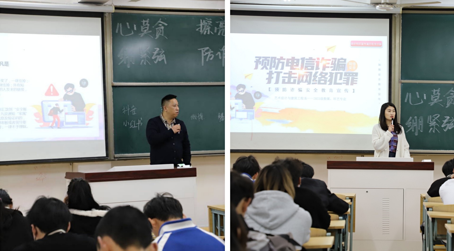艺建系副主任陈宏波在发言中提出,社会上的诈骗事件层出不穷,有很多专门针对在校大学生的诈骗行为,不断有大学生上当受骗,我们必须提高警惕,保障自身人身财产安全。我校也发生过大学生受骗案件,尽管学校一再提醒,仍然有人被骗,这不仅仅是因为诈骗形式越来越多样化,很重要的一点是我们没有足够的警惕心,没能识破坏人的阴谋,从而落网。因此,学校也对防诈骗这一块看得很重,希望每个大学生都能具备一定的防范意识,减少诈骗行为的发生,营造良好的校园环境。