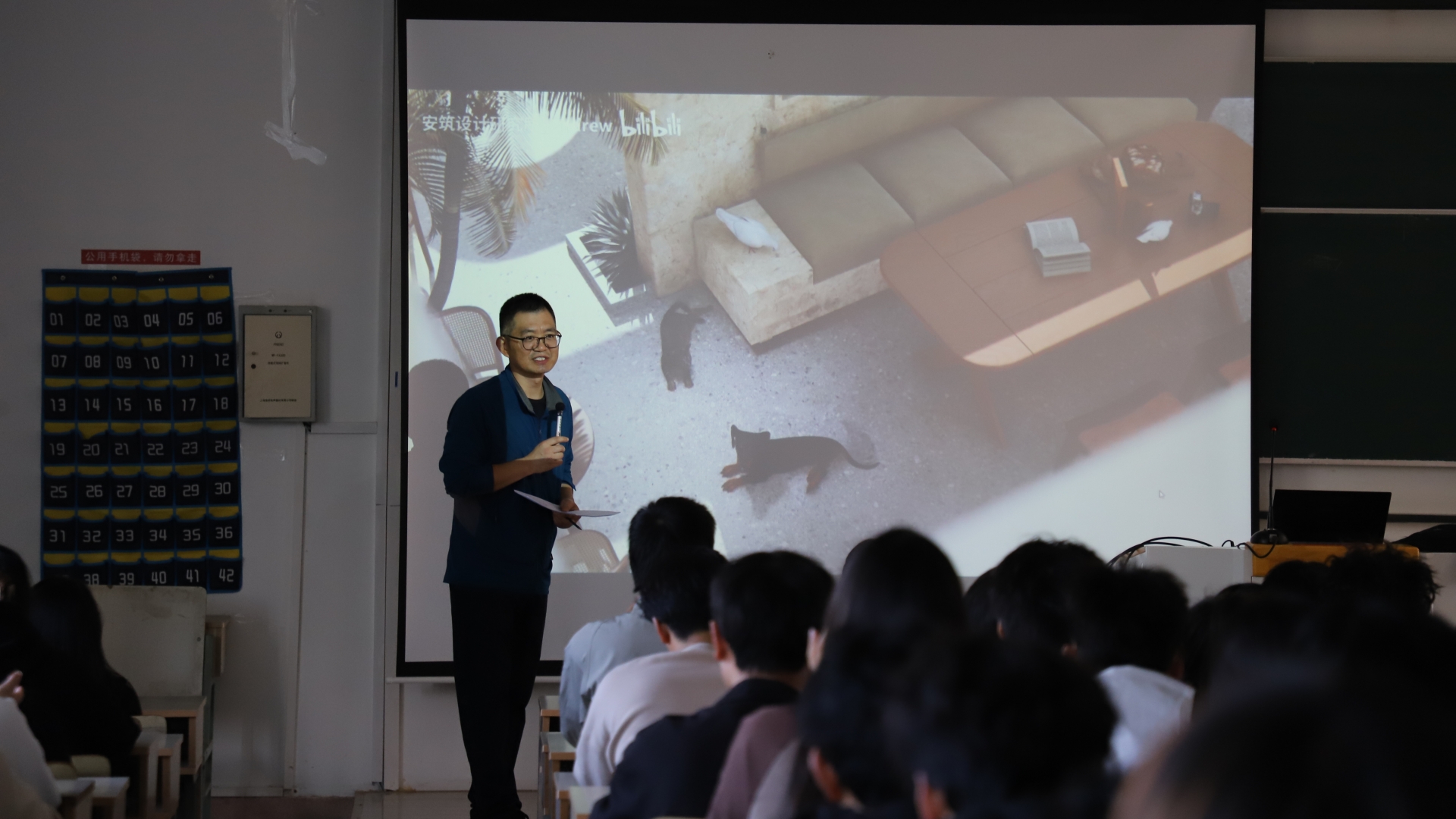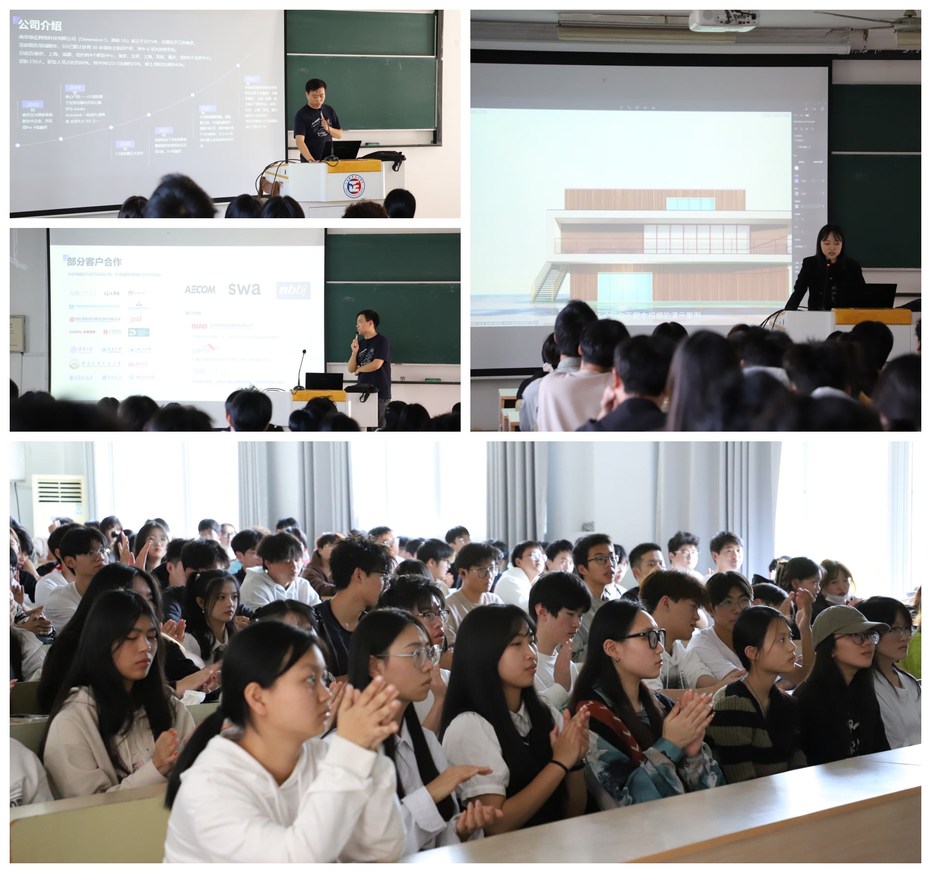 接着维伍科技技术专家钱江悦为全体师生进行了D5渲染器教育版入门基础培训讲解,详细介绍了材质模块、景观植物、建筑体块、动态粒子、室内单品等多主题素材资源库应用方法,素材工具搭建场景和参数设置的技巧。现场操作演示了建筑动画的视频创建功能和实时渲染的编辑方法。其实时操作的效果引起了学生极大的兴趣。最后强调了D5软件操作虽简单,但同时需要大家经验的累积和思考才能熟练更多的技巧,只要有专业的敏感度和软件学习的热情度就一定能够快速使用好D5渲染器,让软件为自己的设计创想服务。