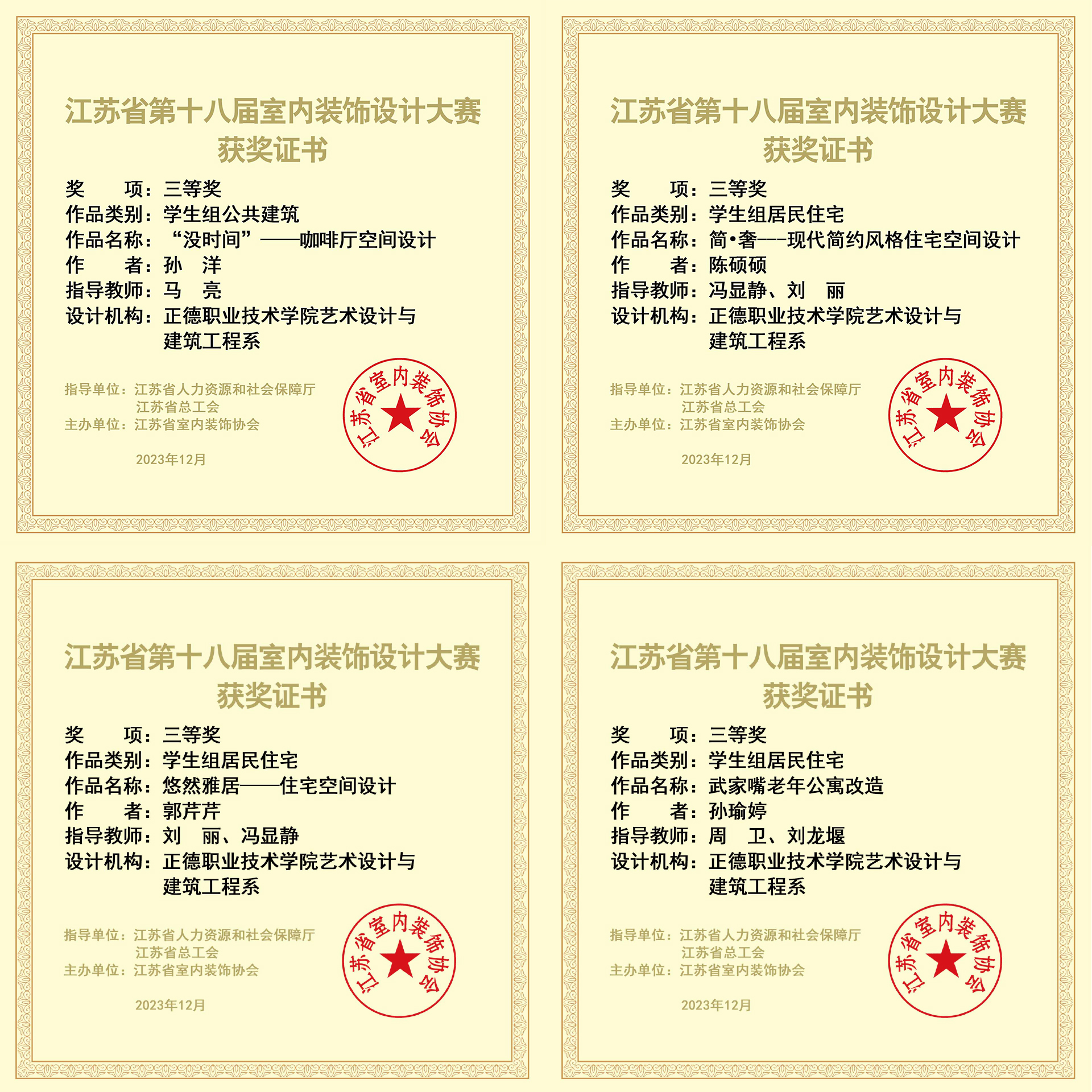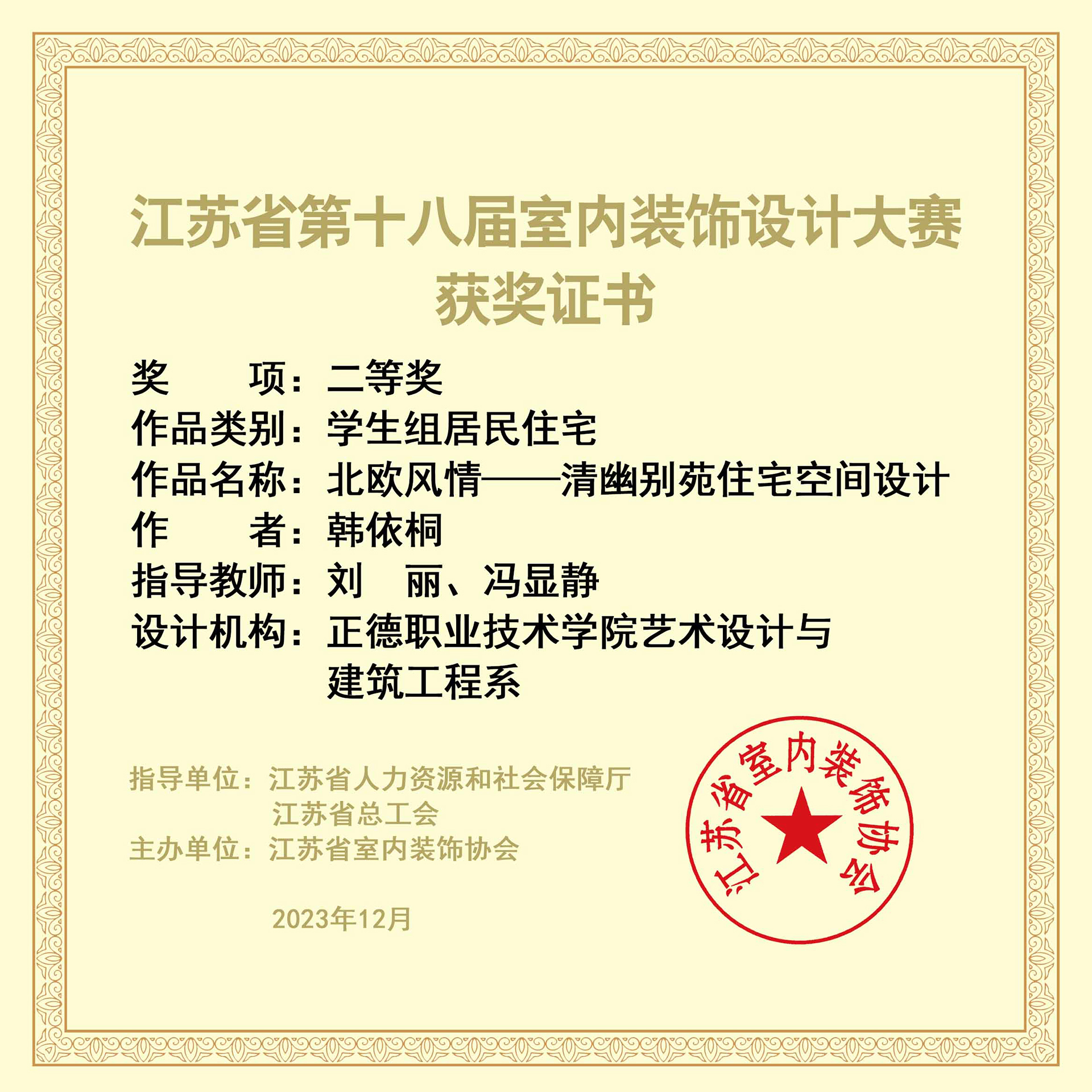 近日,由江苏省人力资源和社会保障厅、江苏省总工会指导,江苏省室内装饰协会主办的“江苏省第十八届室内装饰设计大赛”获奖作品公布。艺术设计与建筑工程系建筑与装饰专业群的学生参赛作品在学生组赛项类别中取得了可喜成绩,1幅作品获得二等奖、4幅作品获得三等奖。