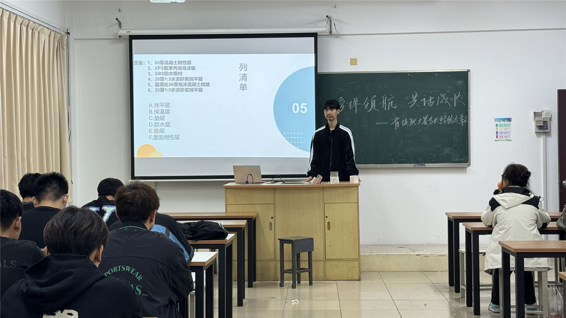 23级工程造价专业的学生们开展了“榜样领航 共话成长”学长经验交流会。活动邀请到了在2024年江苏省职业院校技能大赛高职组“土木建筑类”赛项中获得二等奖,并进入国赛培训班的胥霁洲、徐景瑞、罗杨三位学长。他们分享了自己参赛的宝贵经验,并鼓励同学们积极参与各类专业技能竞赛,不断挑战自我、超越自我。