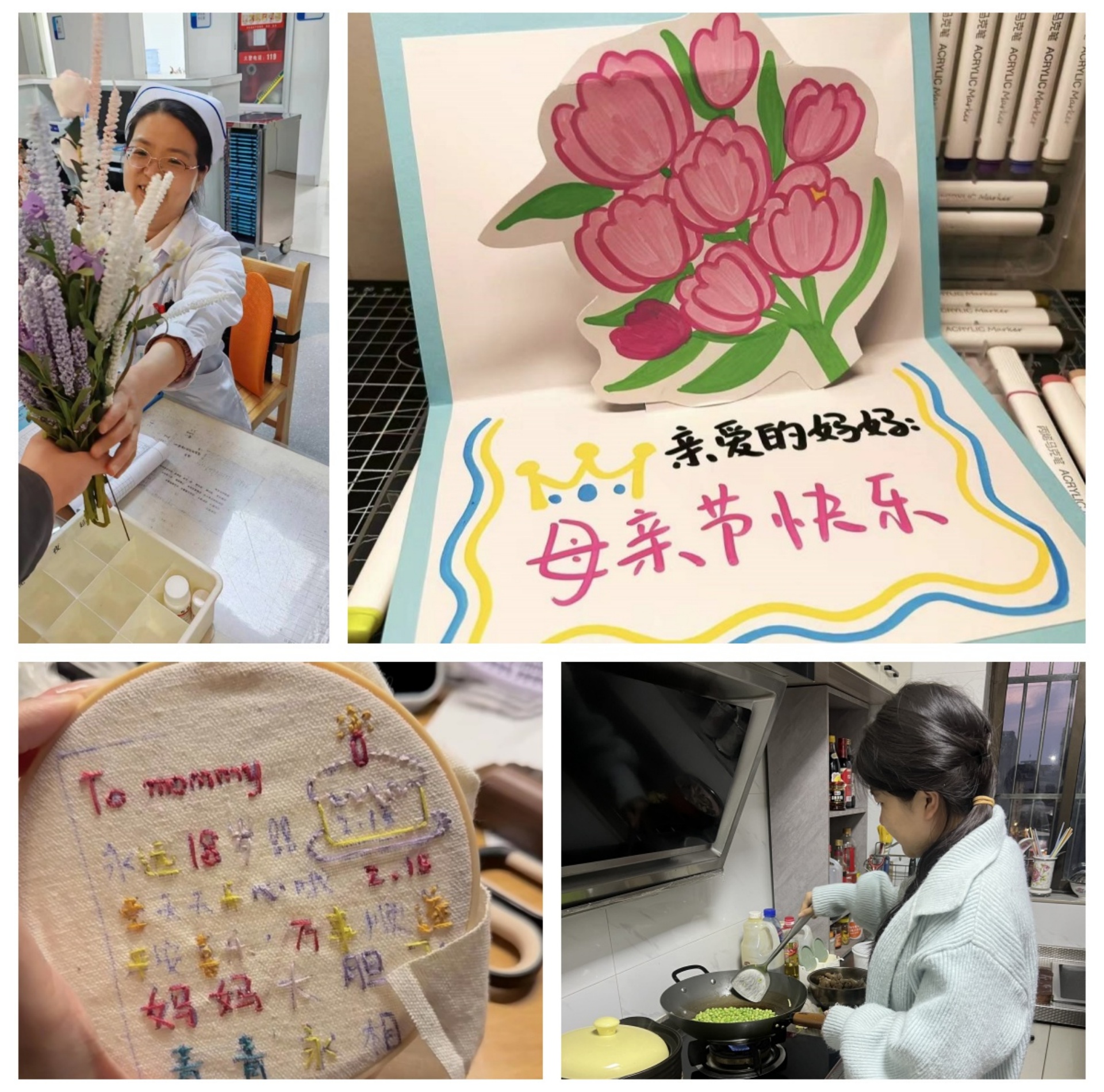 今年的母亲节,同学们以各种各样的形式表达她们对母爱的感谢。有的同学为坚守在医护岗位上的母亲送去了鲜花,以此表达对她们辛勤工作的敬意;有的同学则亲手刺绣,用一针一线编织出对母亲的深深祝福;还有的同学制作了精美的贺卡,写下对母亲最真挚的感谢;更有同学亲自下厨,为母亲烹饪了一顿美味的晚餐,让母亲在忙碌之余也能享受到家的温暖。这些看似简单的举动,却蕴含着同学们对母亲们无尽的感激和深深的爱。