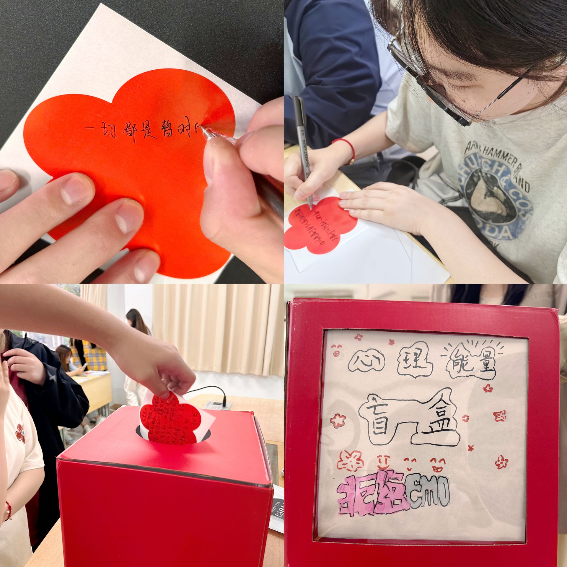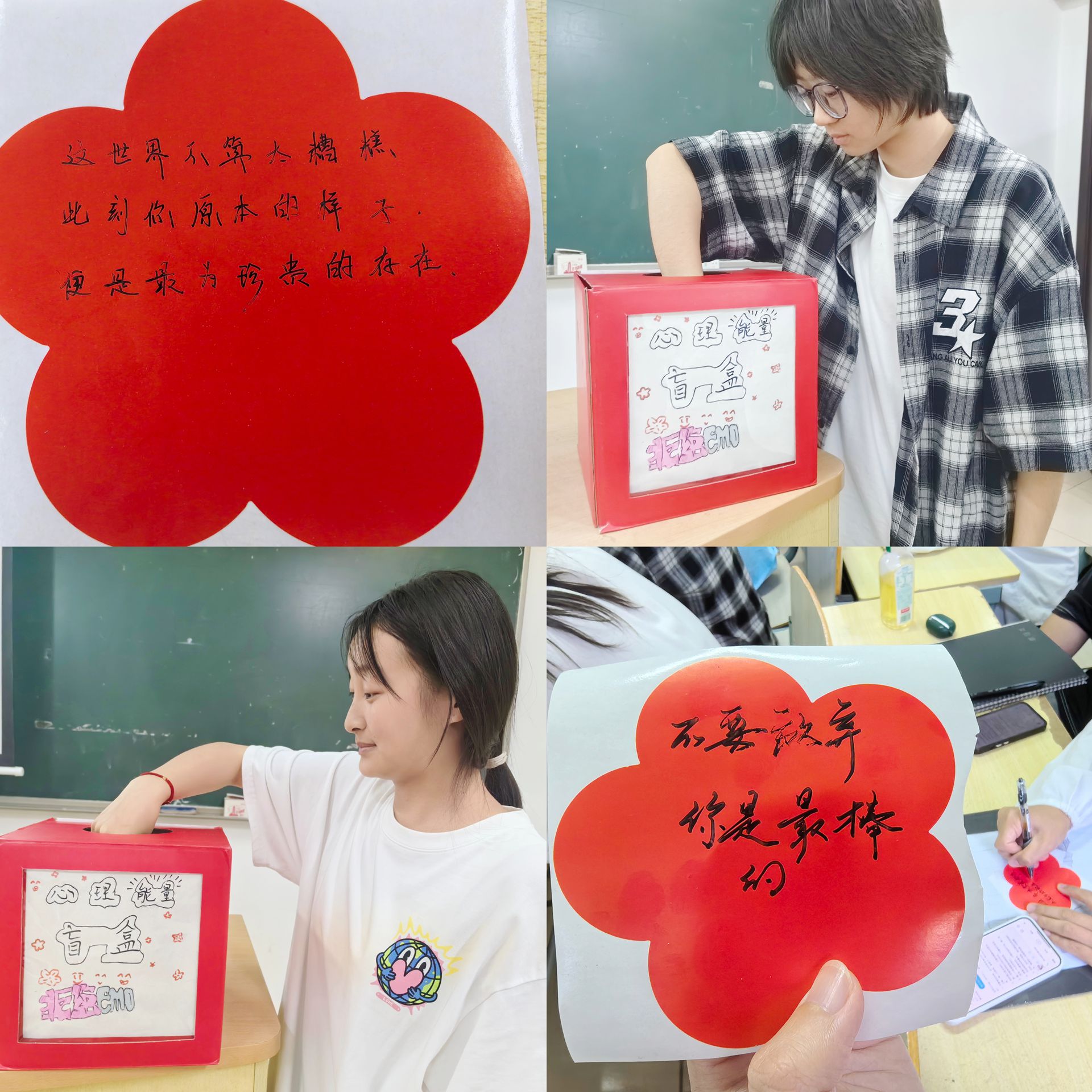 为了增加活动的互动性和趣味性,王思思老师还特别准备了一个学生自制的心理盲盒。同学们将自己的小红花贴纸小心翼翼地放入盲盒中,期待着能够为他人带去一份意外的惊喜和鼓励。随后,大家轮流从盲盒中抽取一朵小红花,阅读上面的寄语,感受那份来自同学之间的真挚关怀和力量。