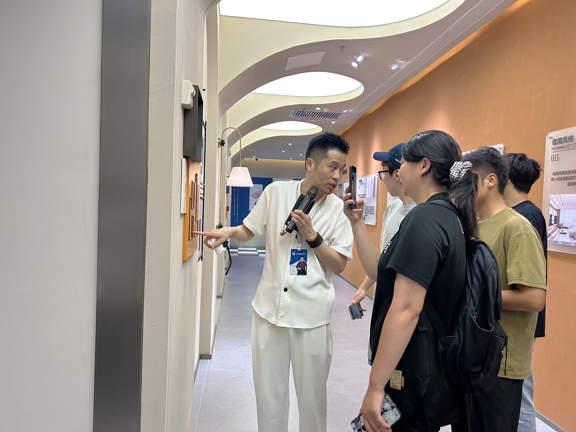 之后,铭望装饰设计总监并担任“铭望订单班”的企业导师的梁东海老师带领同学们分别参观了一层的企业品牌文化展示区、二层的多风格多户型的1:1实景样板间及三楼的家装工艺展示、材料展示(瓷砖、地板、橱柜、洁具等)。结合目前的《住宅空间改造设计》课程,梁老师针对目前市场的行情重点讲解了适老化设计的基本原则,强调了住宅空间改造设计中的重要事项,在某些重要知识点上,还采取一问一答的方式与学生进行互动教学。课堂上讲到的设计风格、空间布局要点直观地展示在面前,各种装饰材料也通过一个个样板间让同学深刻地体会到。同学们面对行业中对技能的真实需求点,纷纷表示回到学校后将更加关注装饰材料、人体工程学等重要知识的学习,首先从画好一张专业的平面布置图入手。