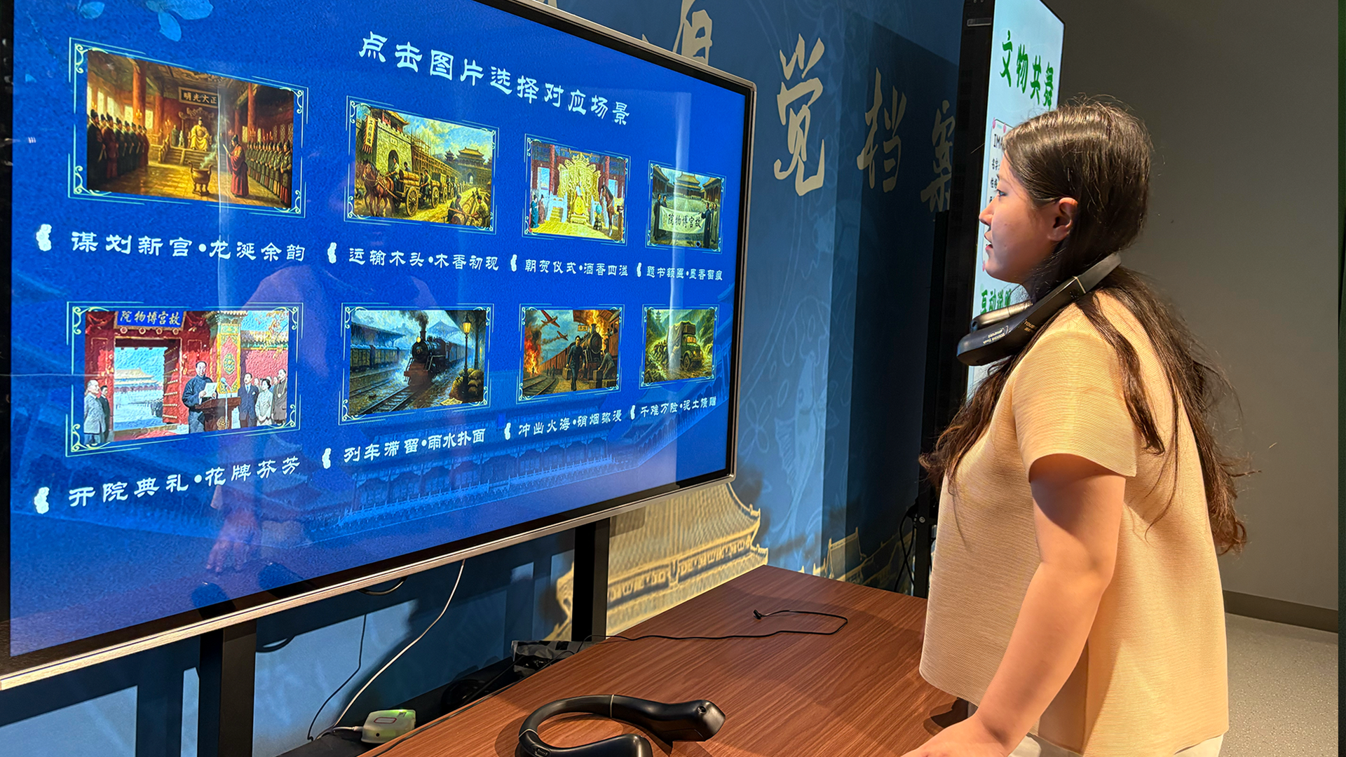 展览现场,AI油画、动态影像、气味模拟装置及数字人导览系统构建起多维感知空间。师生们通过触摸屏与“数字守门人”互动,聆听AI生成的故宫历史解说;在“时空长廊”区域,气味装置同步释放檀香、墨香等场景气息,配合动态光影再现宫廷生活片段。工作人员从技术路径层面详细解析了AI油画的创作逻辑——算法如何通过数万次试错迭代优化画面细节,以及人机协作中艺术家如何赋予作品情感内核,令参观者直观感受到技术赋能下的艺术创新边界。