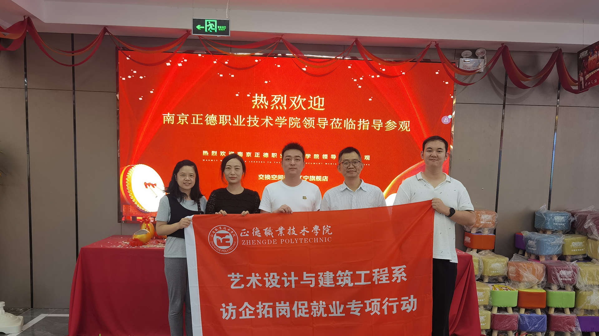 为进一步落实学校访企拓岗促就业专项行动,推进91自拍 毕业生多维度、高质量就业,9月19日,艺术设计与建筑工程系周卫、杨瀛、吴青、夏正宇深入企业为毕业生开拓就业新渠道,走访了南京交换空间家具有限公司(江宁旗舰店),与戴总进行了合作交流,目前校企双方共同探讨合作协议内容,初步达成合作意向。