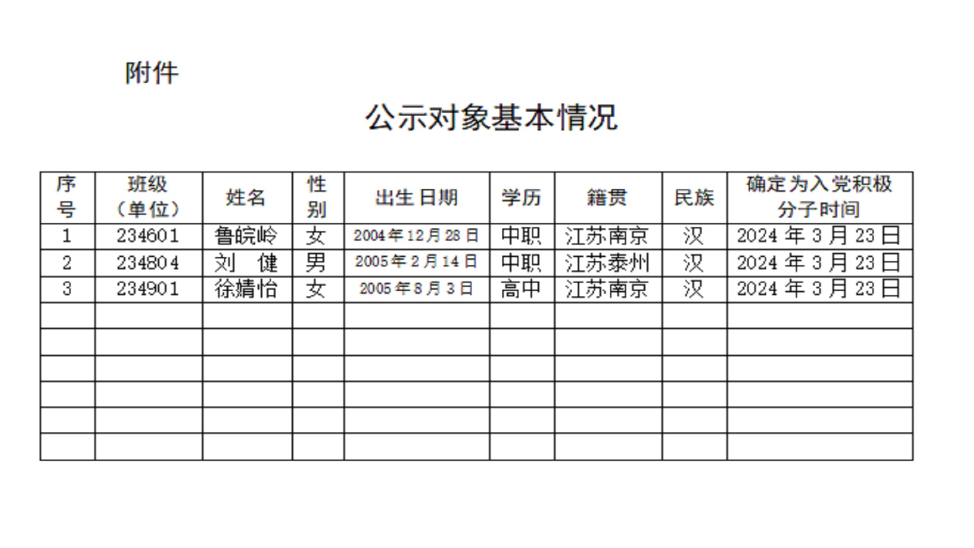 经党支部培养教育和考察,在听取党小组、培养联系人、党员和群众意见的基础上,经支委会2025年3月24日讨论,拟确定鲁皖岭、刘健等3位同志为发展对象。根据发展党员工作有关要求,现将其有关情况予以公示(见附件)。