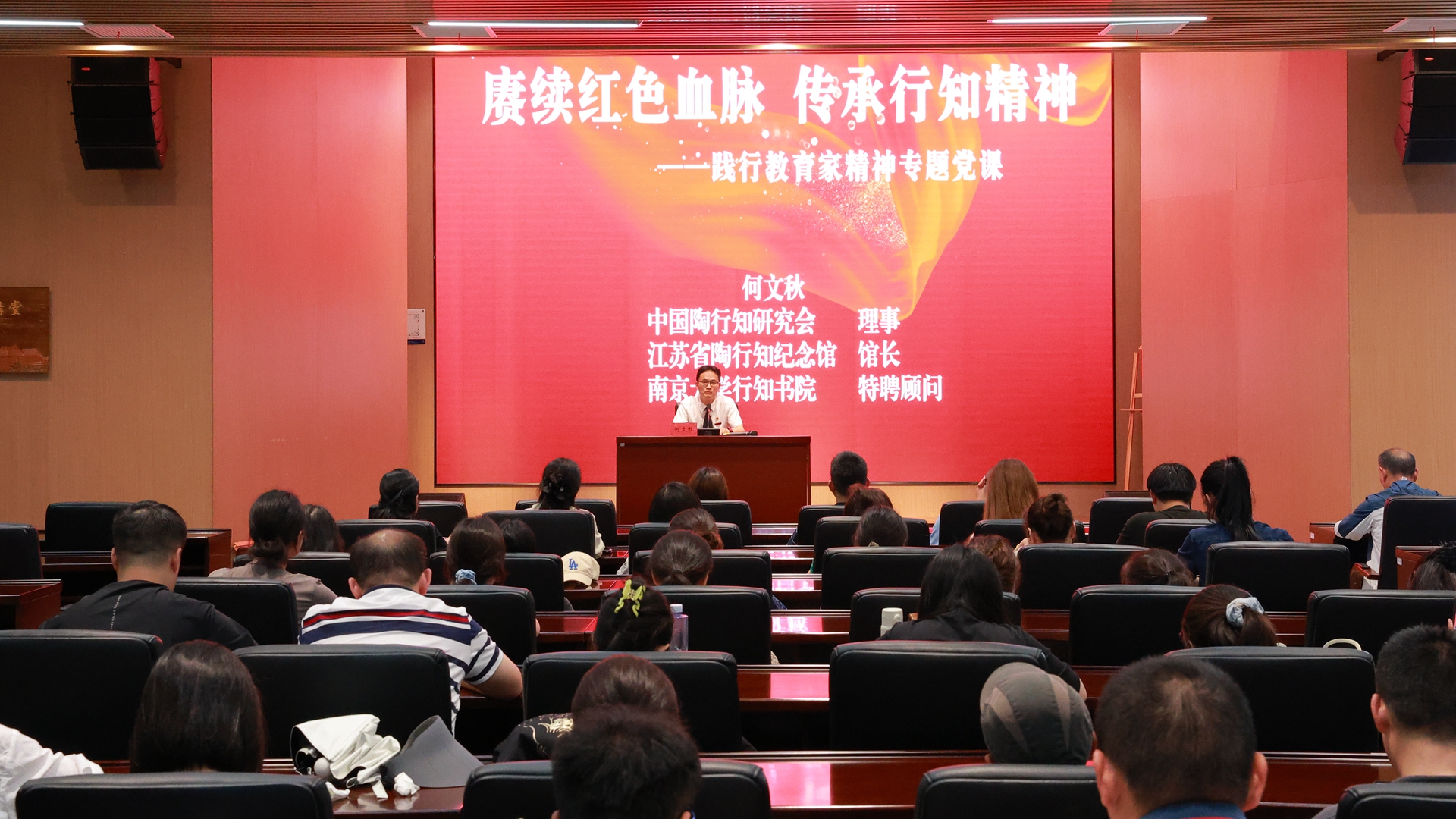 接着,南京晓庄学院陶行知研究院党支部书记、江苏省陶行知纪念馆馆长何文秋,以其深厚的学术功底和丰富的实践经验,为大家带来了一场主题为《赓续红色血脉,传承行知精神》的专题党课。何馆长从陶行知先生“捧着一颗心来,不带半根草去”的教育誓言出发,系统解读了陶行知教育思想的核心要义,深入剖析了“生活即教育”“社会即学校”“教学做合一”三大理念的实践价值。他特别指出,陶行知先生的廉洁奉公、生活简朴精神,与新时代师德师风建设高度契合,是全体党员教师学习的典范。他呼吁全体党员教师以行知精神为镜,严守职业操守,杜绝教育腐败。他引用习近平总书记多次提及的陶行知名言“千教万教教人求真,千学万学学做真人”,勉励教师们“以真为魂,以廉为基”,做学生成长路上的引路人。何馆长的党课内容丰富、思想深刻,使在场的每一位党员都深受启发。