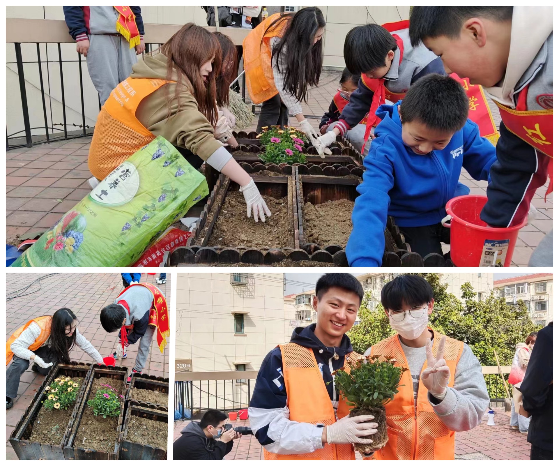 3月13日活动当天,同学们组成志愿小队前往上怡新村社区开展志愿服务。在与社区负责人进行简单的对接之后,同学们纷纷投入到志愿服务中去。在活动现场同学们有的安装花盆,有的搅拌土壤,撕泡沫板并联合当地中小学的小朋友们一起开展“大手拉小手共筑绿色梦”的小活动,跟小朋友们一起种花,植树。