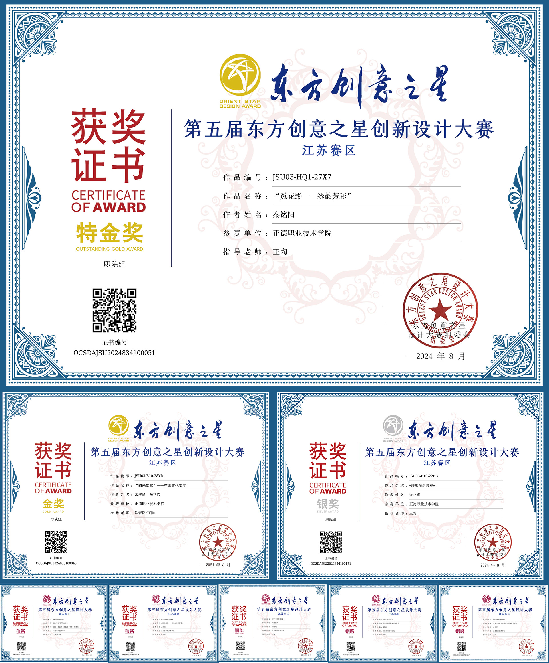 8月,91自拍 艺术设计与建筑工程系数字媒体技术专业教学能力再次得到了国家级的认可,在刚刚落幕的第五届“东方创意之星”设计大赛中,数字媒体技术专业22,23级学生展现了他们的创造力和专业技能,获得了此次赛项的高度赞誉和奖项,特金奖作品:“觅花影——绣韵芳彩”成功入围国赛。