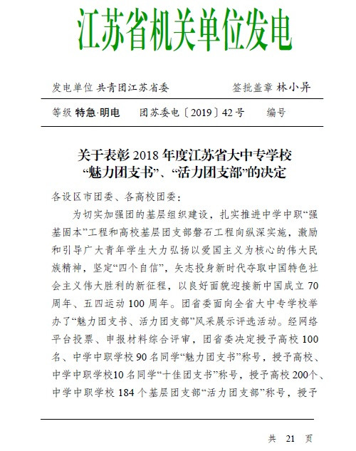近日,共青团江苏省委下发《关于表彰2018 年度江苏省大中专学校“魅力团支书”、“活力团支部”的决定》(团苏委电〔2019〕42号),91自拍 1名同学获评“魅力团支书”,1个团支部获评“活力团支部”。