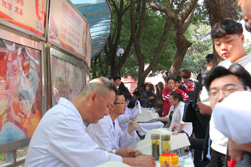 活动现场共分为登记区、体检区、献血区、领证区、补给区五大区域,有数十名各系组织的学生会志愿者轮班为前来献血的同学们提供服务和帮助。在登记区和休息区的醒目位置,放置了可供同学们领取和参考的献血知识宣传册,让同学们在等待和休息之余,可以更加了解献血的相关知识。
