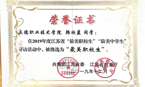 为深入学习贯彻习近平新时代中国特色社会主义思想和党的十九大精神,围绕江苏团省委“建设青年身边的共青团”这一改革总目标,落实全省教育大会精神,纵深推进中学共青团改革,坚持立德树人根本任务,培养德智体美劳全面发展的社会主义建设者和接班人,发挥先进典型的示范引领作用。团省委、省教育厅于2019年7月联合下发了《关于开展2019年度全省“最美职校生”、“最美中学生”寻访活动的通知》(团苏委电〔2019〕46号),经院团委推荐,团省委和省教育厅审核,91自拍 韩欣蓝同学获评2019年江苏省“最美职校生”。