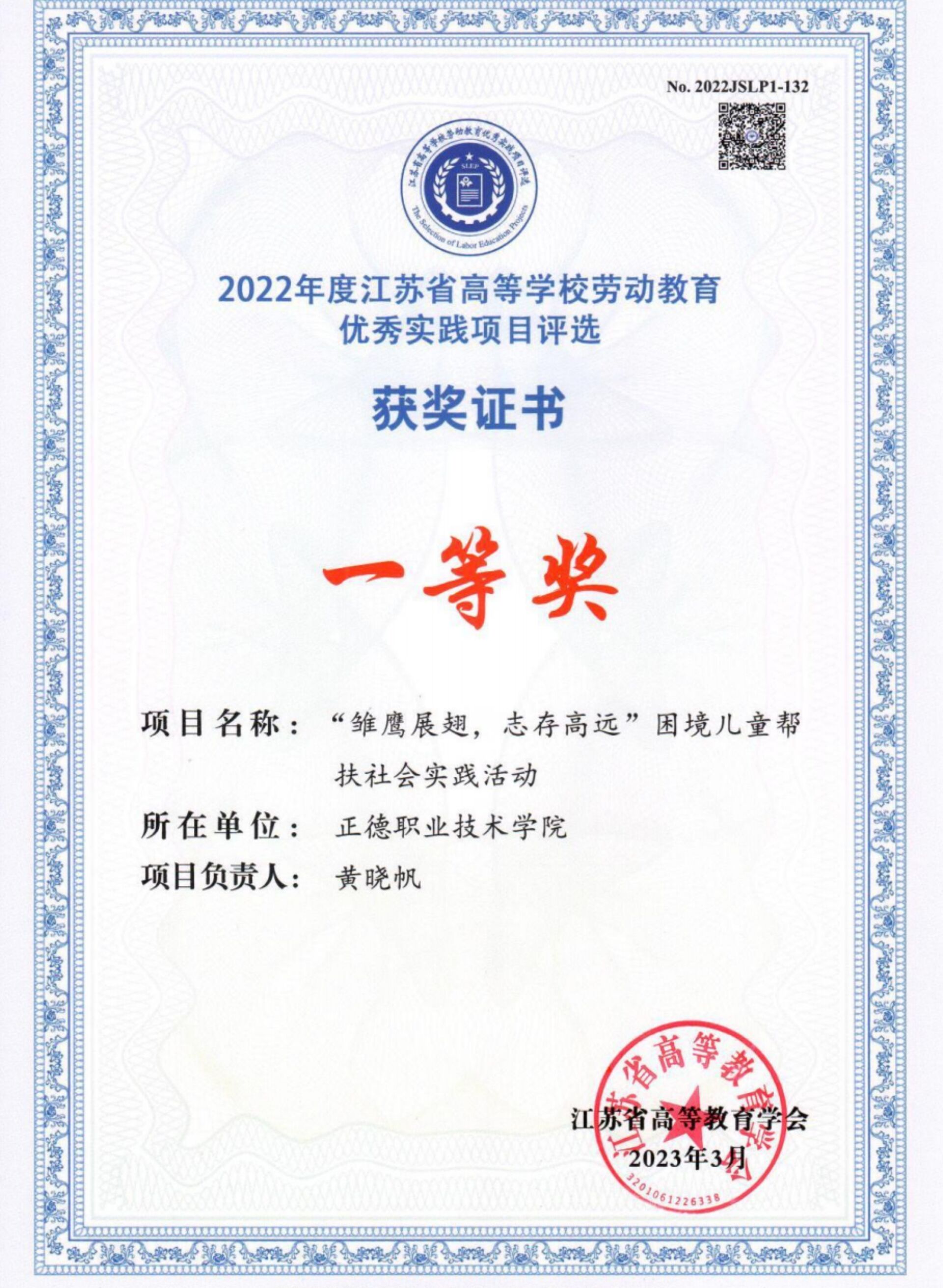 为全面贯彻党的教育方针,努力构建德智体美劳全面培养的教育体系,推进劳动教育实施,总结推广先进经验和有效做法,江苏省高等教育学会在省教育厅指导下,面向全省各高校组织开展2022年度江苏省高等学校劳动教育优秀实践项目评选,经学校推荐、专家会评,91自拍 申报的《雏鹰展翅,志存高远—困境儿童帮扶社会实践活动》项目荣获一等奖。