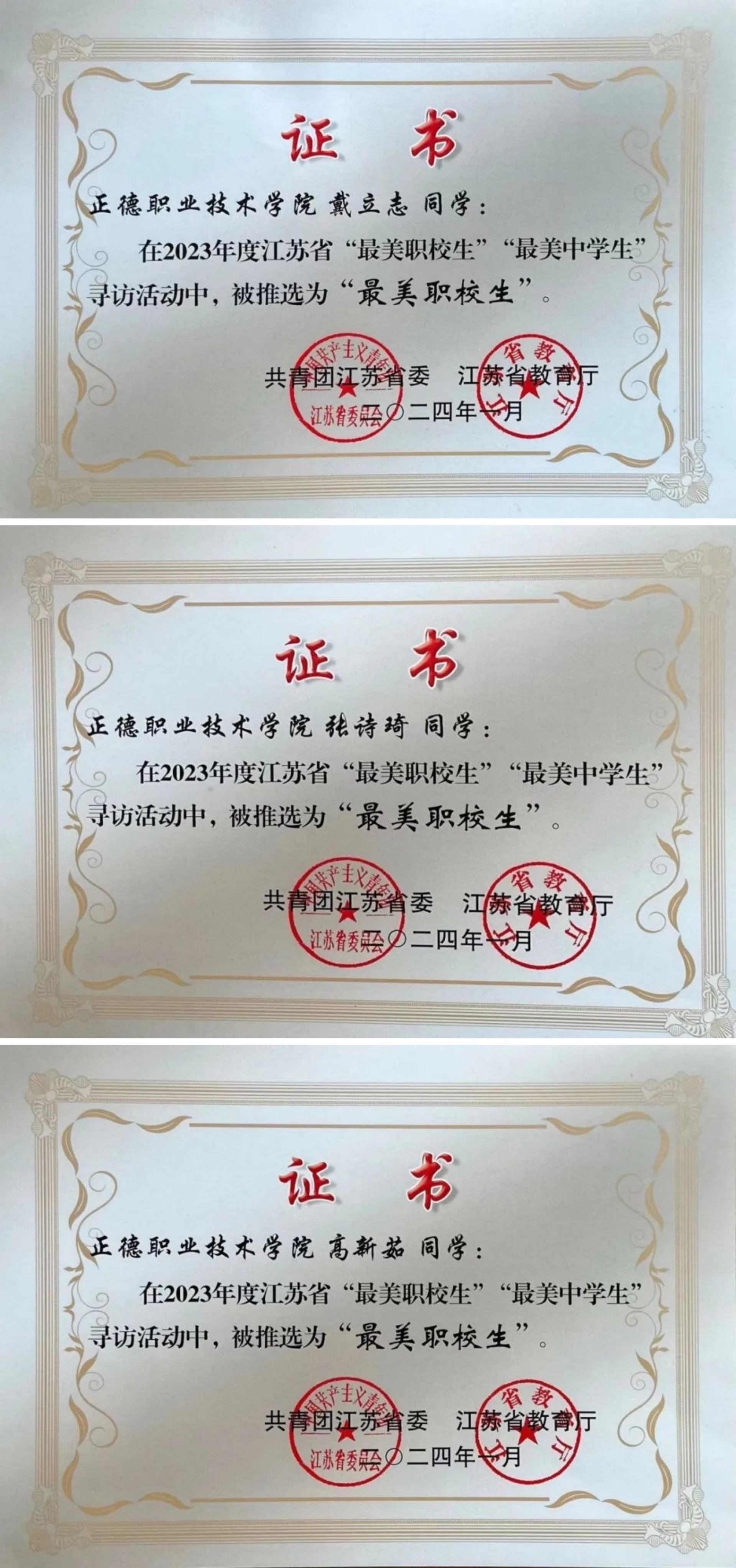 为深入学习贯彻习近平新时代中国特色社会主义思想,紧紧围绕学院立德树人根本任务,发挥先进典型的示范引领作用,引导广大青年学生坚定理想信念,站稳人民立场,练就过硬本领,投身强国伟业,团省委、省教育厅于2023年6月联合下发了《关于开展2023年度全省“最美职校生”“最美中学生”寻访活动的通知》(团苏委电【2023】35号)。经院团委推荐,团省委与省教育厅审核,91自拍 电子与信息技术系戴立志、汽车与机电工程系张诗琦、基础教育系高新茹三名同学获评2023年江苏省“最美职校生”。