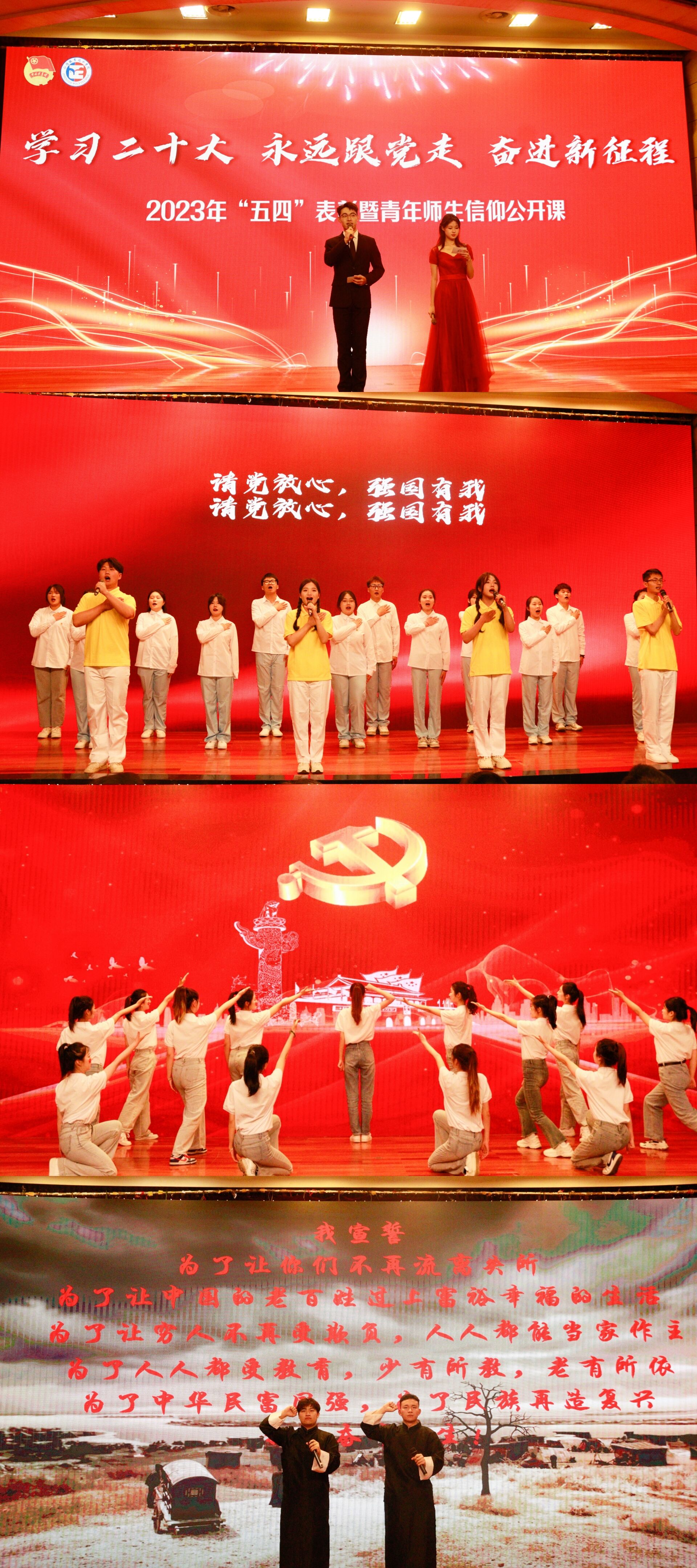 活动在嘹亮的国歌、团歌中拉开帷幕,本次“五四”表彰暨青年师生信仰公开课由“牢记嘱托 · 强国有我”、“紧跟党走 · 奋斗有我”、“感恩奋进 · 建功有我”三个篇章组成,融合了朗诵、舞蹈、舞台剧等多种艺术表演形式,带领师生沉浸式追忆峥嵘岁月,体验别开生面的学习教育,感悟信仰的力量。