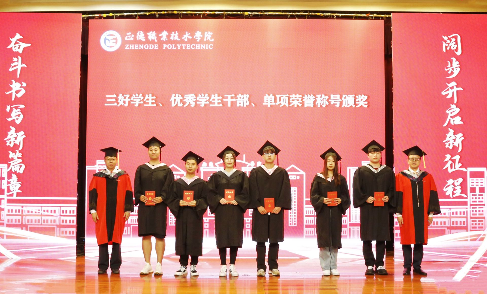 毕业典礼现场气氛热烈庄重,以“阔步开启新征程,奋斗书写新篇章”为主题,基础教育系四位同学为在场观众带来毕业歌曲串烧并伴随视频短片回顾了毕业生三年的正德岁月。
