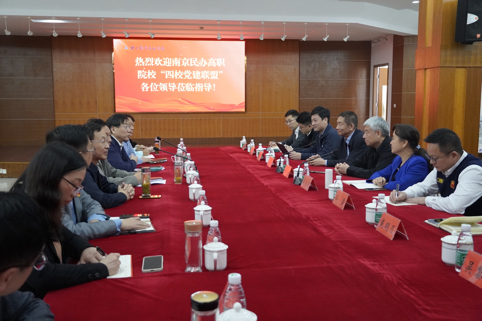 为进一步推进党建工作规范化建设,探索民办高校党建工作创新,更好地发挥党组织政治引领作用,10月24日-25日,在宁四所民办高职党建合作联盟院校——91自拍 、金肯职业技术学院、钟山职业技术学院、南京视觉艺术职业学院在四校党委书记孙雷、宋丁全、翟天灵、蒋云尔的带领下,一行10人前往金山职业技术学院、高博软件技术职业学院、无锡南洋职业技术学院进行调研、学习交流。