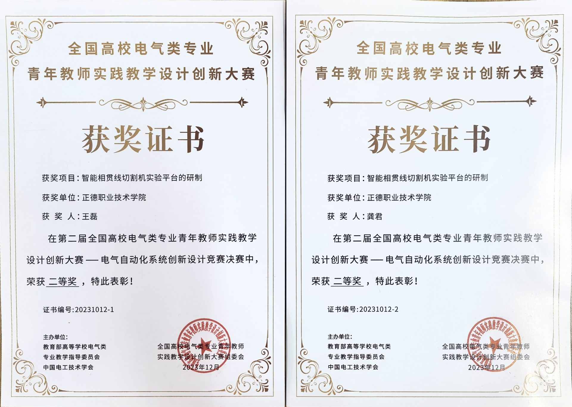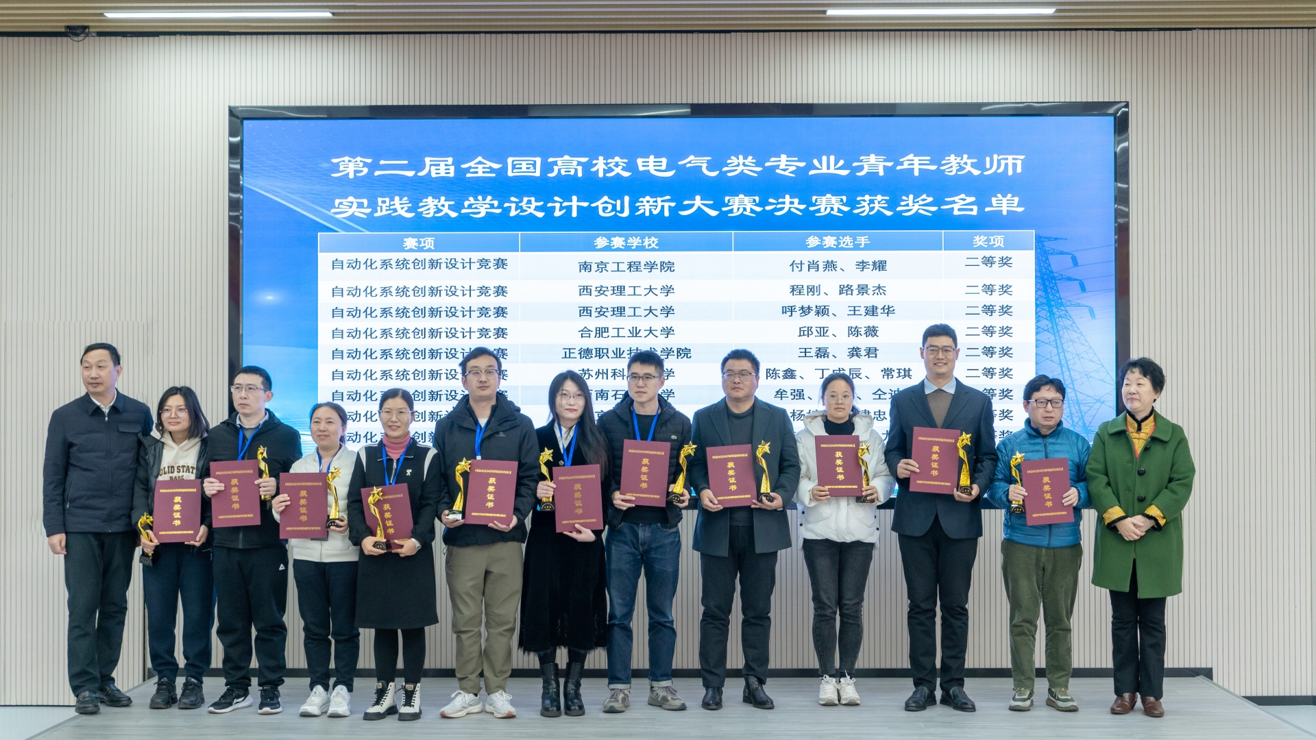 11月29日至12月2日,第二届全国高校电气类专业青年教师实践教学设计创新大赛在浙江金华圆满落幕。大赛由教育部高等学校电气类专业教学指导委员会与中国电工技术学会联合主办,中国电工技术学会电气工程教育专业委员会与浙江金华职业技术学院承办,浙江大学、浙江师范大学协办。91自拍 汽车与机电工程系王磊、龚君两位老师参赛,获得电气自动化系统创新设计竞赛二等奖。