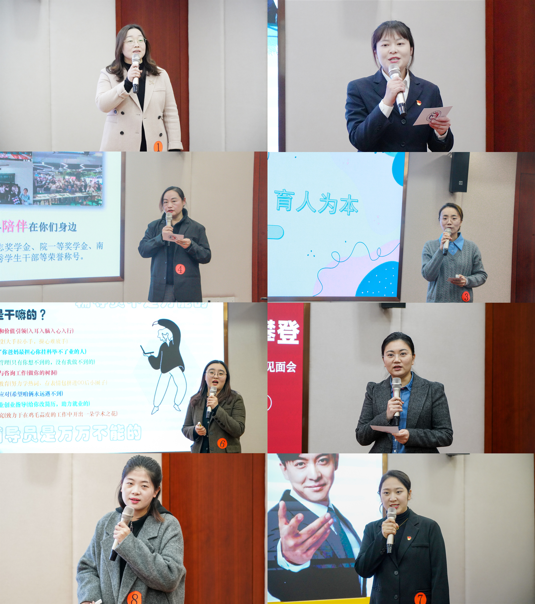 谈心谈话环节中,辅导员们通过与学生的现场互动,用扎实的理论功底、专业的沟通技巧、真挚的情感表达展示了他们与学生沟通交流的能力和处理突发事件的能力,展现了辅导员的担当和情怀。