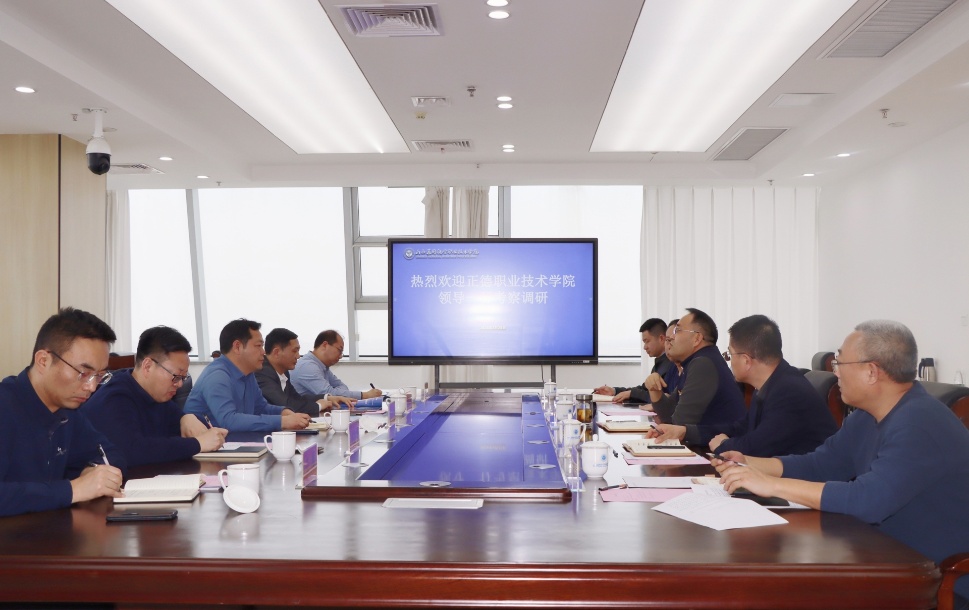 孙永荣一行先后参观了学院实训中心、实训机库、图书馆等场所,期间,阎雷介绍了大同市通航产业现状和学院的基础设施建设情况,建设发展的经验做法等,并召了开座谈会。
