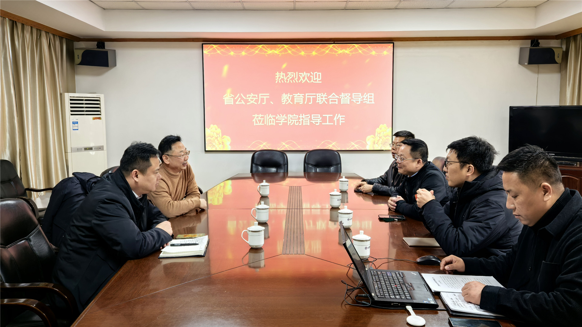 在学院行政楼二楼会议室,召开安全检查现场会议。院党委书记、政府督导专员孙雷,副院长高斌及相关部处负责人出席会议。会上,孙雷代表学院对联合督导工作组一行的到来表达了热烈欢迎与衷心感谢,随后简要介绍了学院的办学历史以及基本情况。孙雷强调,学院始终将习近平总书记关于安全生产重要论述精神落到实处,秉持统筹发展和安全的理念,不断夯实安全责任基础,以严谨细致的态度抓好安全防范各项工作。同时,他也希望工作组能够为学院的安全工作提供宝贵的意见和建议,助力学院高质量平安校园建设迈向新台阶。