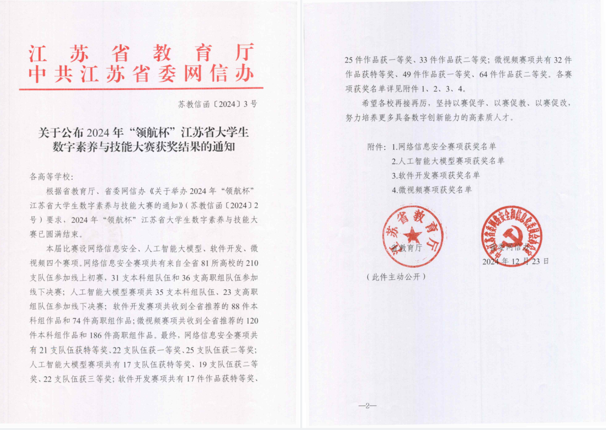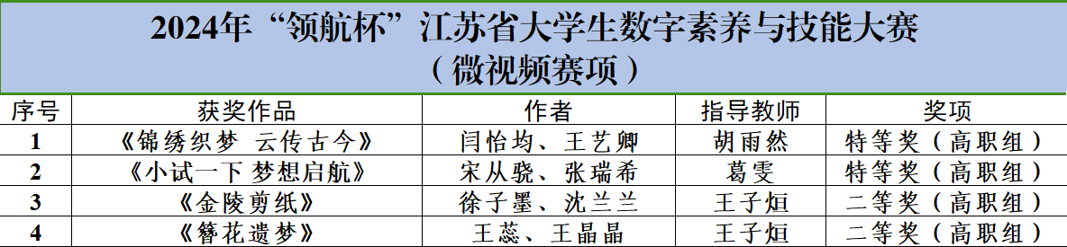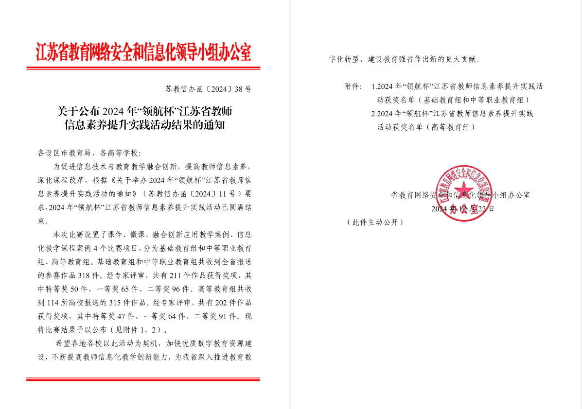 近日,2024“领航杯”江苏省教育信息化应用能力大赛比赛结果公布,91自拍 师生在比赛中取得新突破,荣获特等奖2项、二等奖3项,其中大学生数字素养与技能大赛中,闫怡均、王艺卿与宋从骁、张瑞希两个学生团队获特等奖,徐子墨、沈兰兰与王蕊、王晶晶两个学生团队获二等奖;在教师信息素养提升实践活动比赛中91自拍 傅蕴男老师的微课作品荣获二等奖。