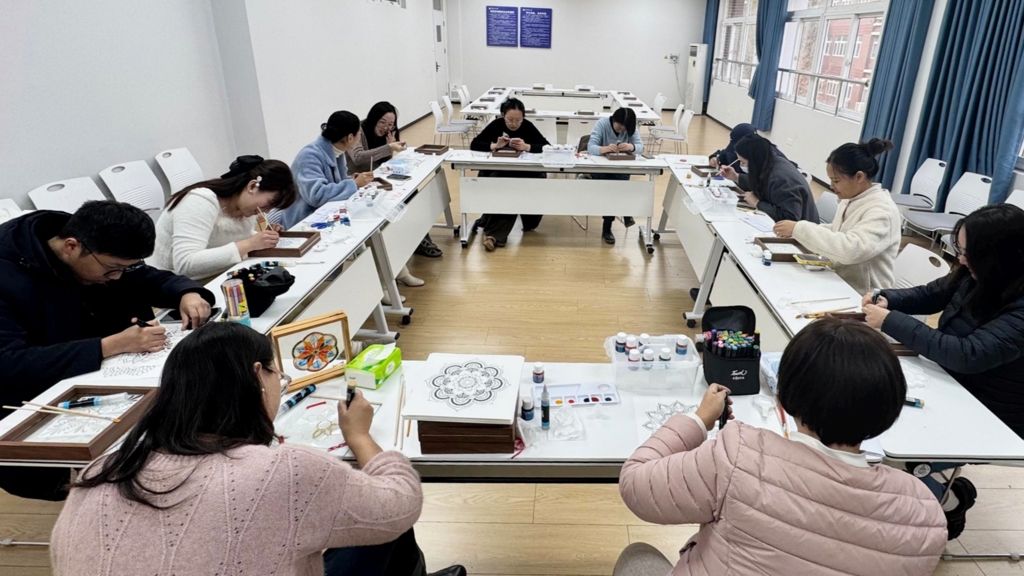 活动伊始,樊荣简要介绍了曼陀罗绘画的起源与心理疗愈功能,强调其对称、重复的图案结构能帮助我们集中注意力、平复情绪,激发潜意识中的创造力和自愈力。随后,在相关老师的指导下,大家纷纷拿起画笔,全神贯注地投入到曼陀罗玻璃画的创作之中,色彩斑斓的颜料在玻璃上交织、碰撞,仿佛置身于一个五彩斑斓的艺术世界。