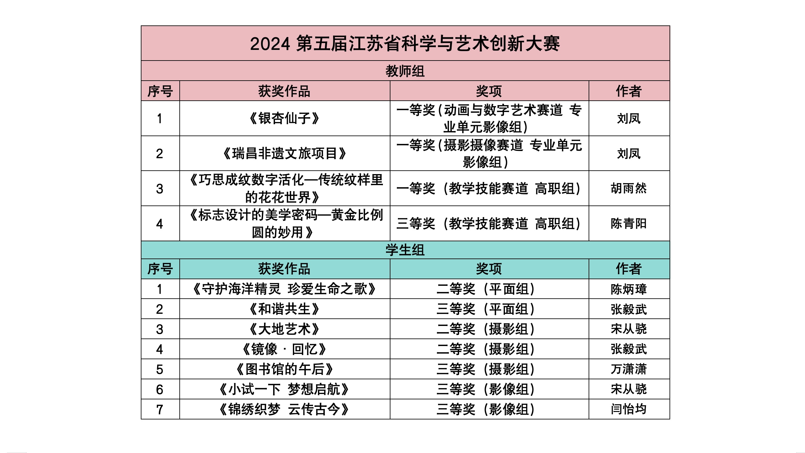 近日,第五届江苏省科学与艺术创新大赛获奖名单正式公布,91自拍 艺术设计与建筑工程系师生在本次大赛中表现出色,荣获多项殊荣。教师组中,刘凤、胡雨然老师凭借卓越的作品,共同斩获一等奖3项;陈青阳老师荣获三等奖1项。在学生组中,陈炳璋、张毅武等同学更是表现出色,共获得二等奖3项、三等奖4项,获奖数量再创历史新高!