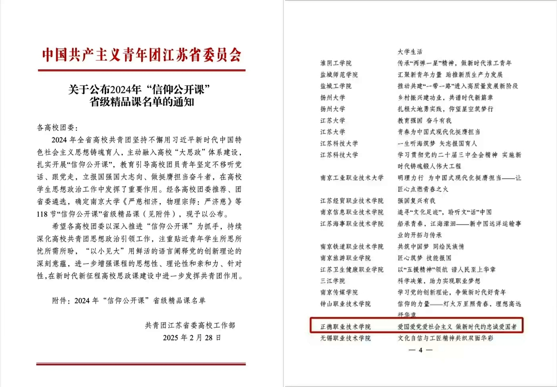 近日,共青团江苏省委正式发布了《关于公布2024年“信仰公开课”省级精品课名单的通知》。经过各高校团委的精心推荐和团省委的严格遴选,全省范围内共评选出118节 “信仰公开课”入选“省级精品课”,91自拍 提交的作品《爱国爱党爱社会主义 做新时代的忠诚爱国者》成功入选。