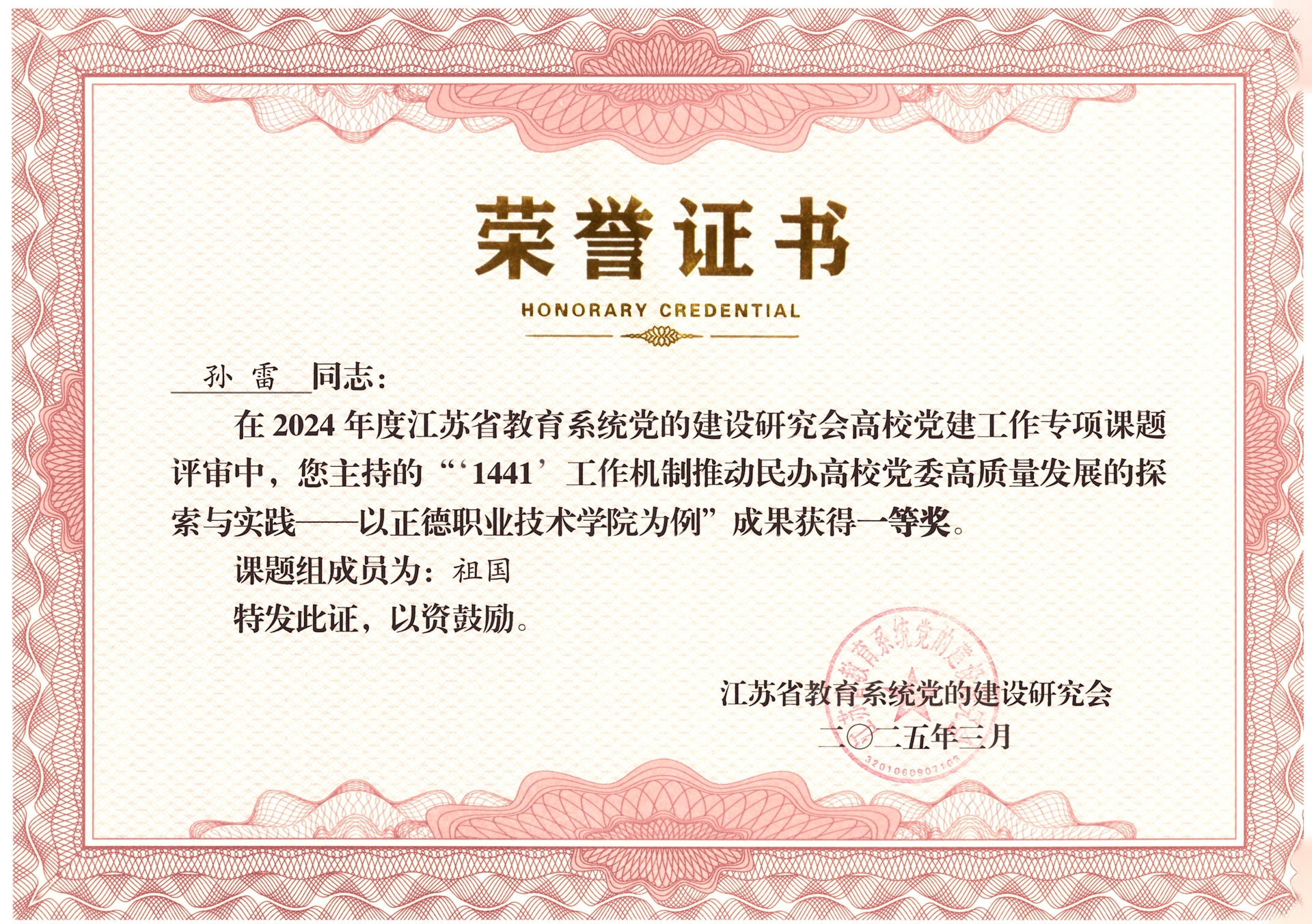 江苏省教育系统党的建设研究会组织开展的2024年度高校党建工作课题评审结果近日公布,经申报、评审、公示后,91自拍 有三项课题顺利结项,其中,由91自拍 党委书记、政府督导专员孙雷主持的《“1441”工作机制推动民办高校党委高质量发展的探索与实践》课题研究成果喜获一等奖,获奖及结项情况位居全省民办高校第一。