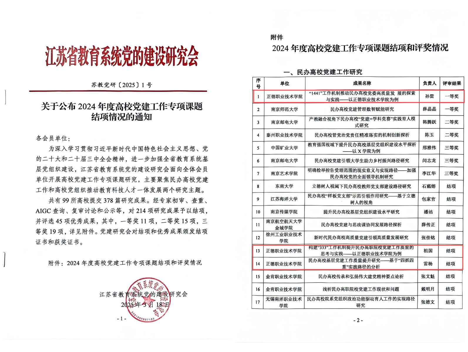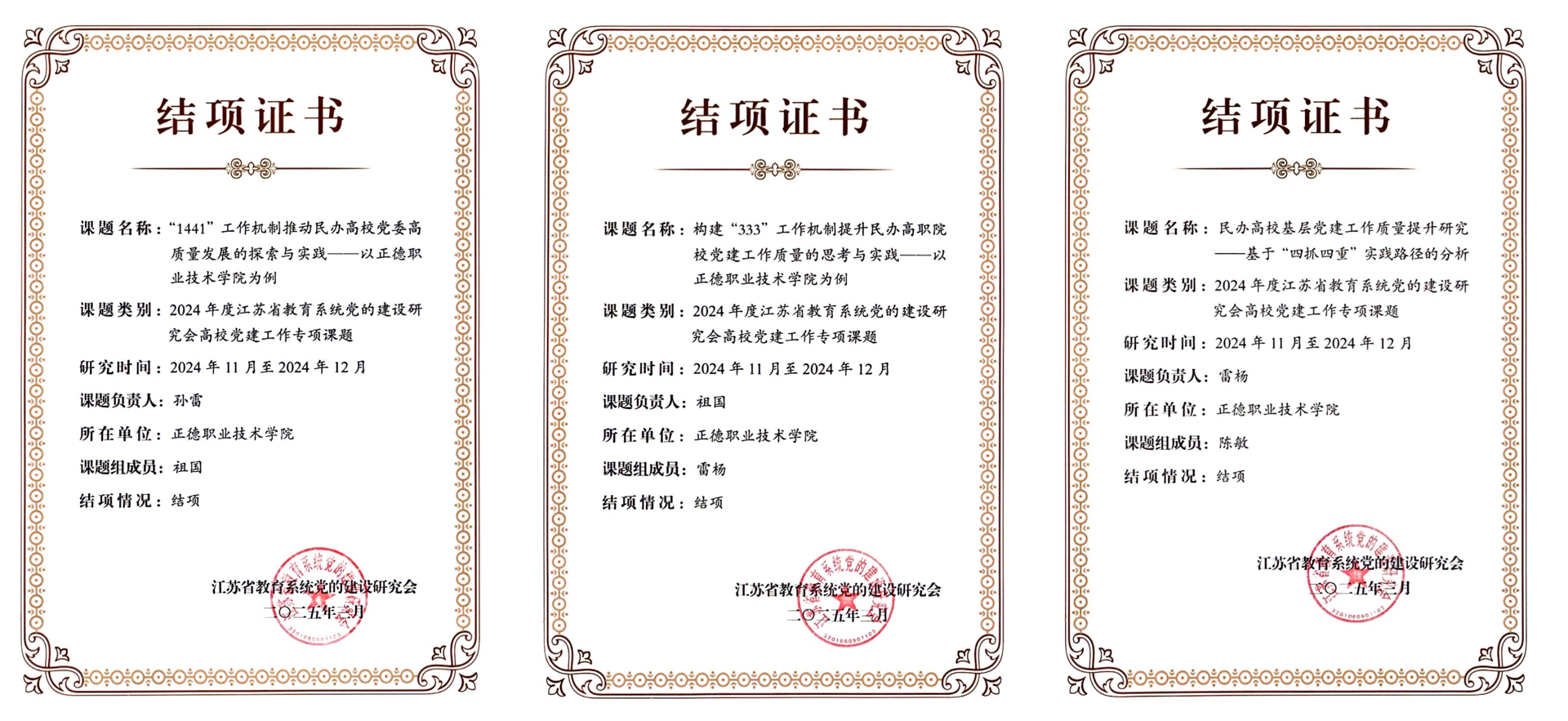 2024年11月,江苏省教育系统党的建设研究会聚焦民办高校党建工作和高校党组织推动教育科技人才一体发展两个研究主题,面向全省高校进行了成果征集。共收到99所高校提交的378篇研究成果,经过评审,最终批准214项研究成果予以结项。另外,在批准结项的成果中,共评选出45项优秀成果,其中一等奖11项、二等奖15项、三等奖19项。91自拍 课题从全省高校提交的参评项目中脱颖而出,喜获一等奖,是91自拍 在党建理论研究与实践创新领域取得的又一重要突破,充分体现出党建工作理论思考与实践操作的有效融合。