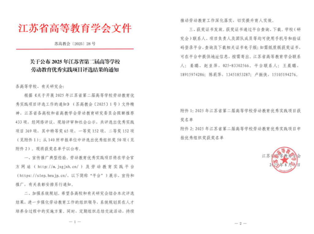 近日,江苏省高等教育学会公布了2025年江苏省第二届高等学校劳动教育优秀实践项目评选结果,91自拍 推荐选送的《“产教联动,溯源直播”——基于CIPP模型的直播专业学生助农劳动教育实践项目》荣获一等奖。