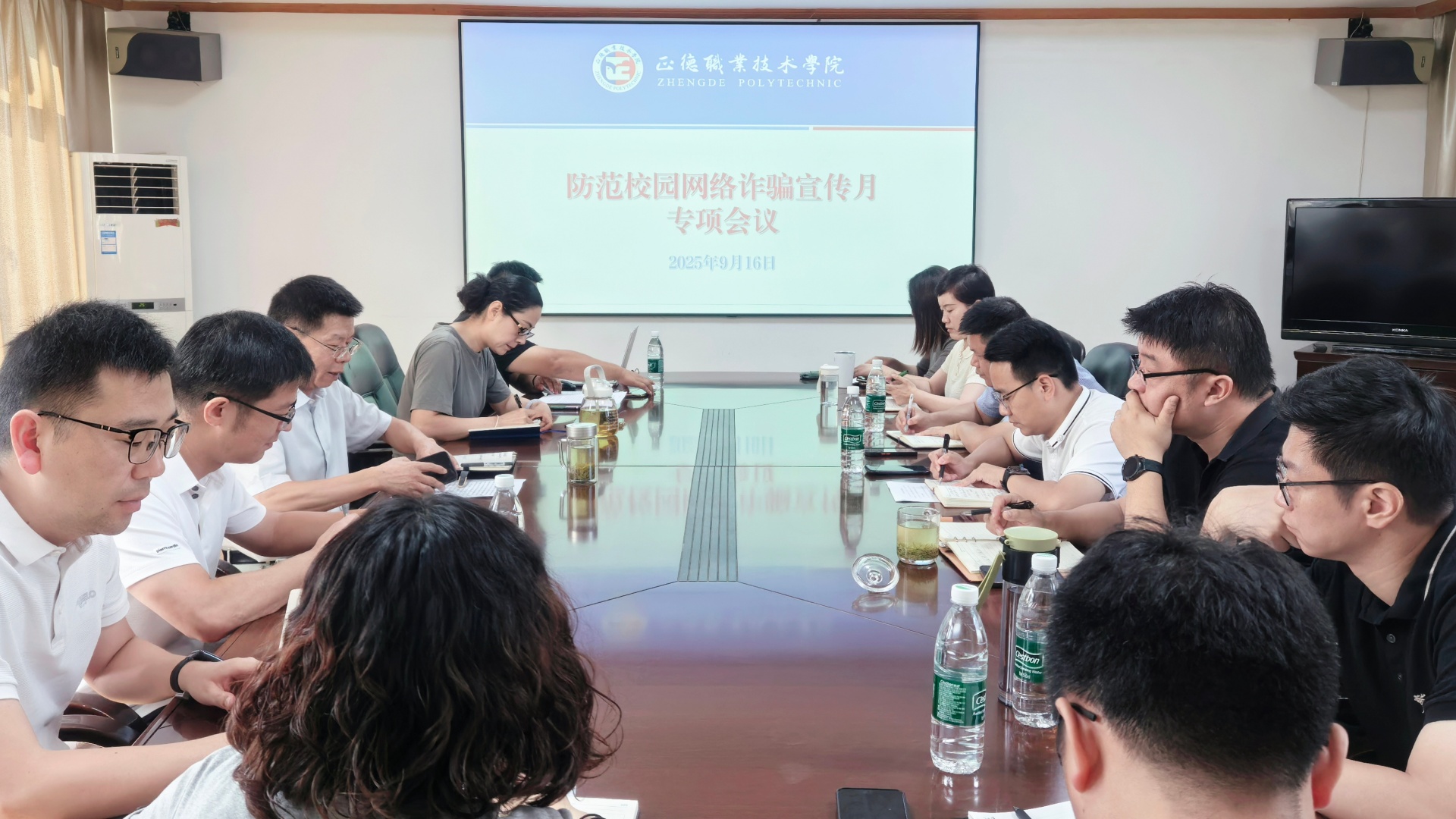 会上,后勤保卫处处长陈宏波首先传达省教育厅相关通知精神,明确工作要求与方向;后勤保卫处副处长丁胜则通报在宁高校1-8月电信网络诈骗警情概况,并结合91自拍 实际,深入剖析各系同期学生诈骗案件数据、类型及高发诱因,为后续精准防控提供数据支撑。随后,各参会单位围绕本部门安全教育举措展开交流研讨,汽车与机电工程系、艺术设计与建筑工程系分享了该系反诈工作经验。