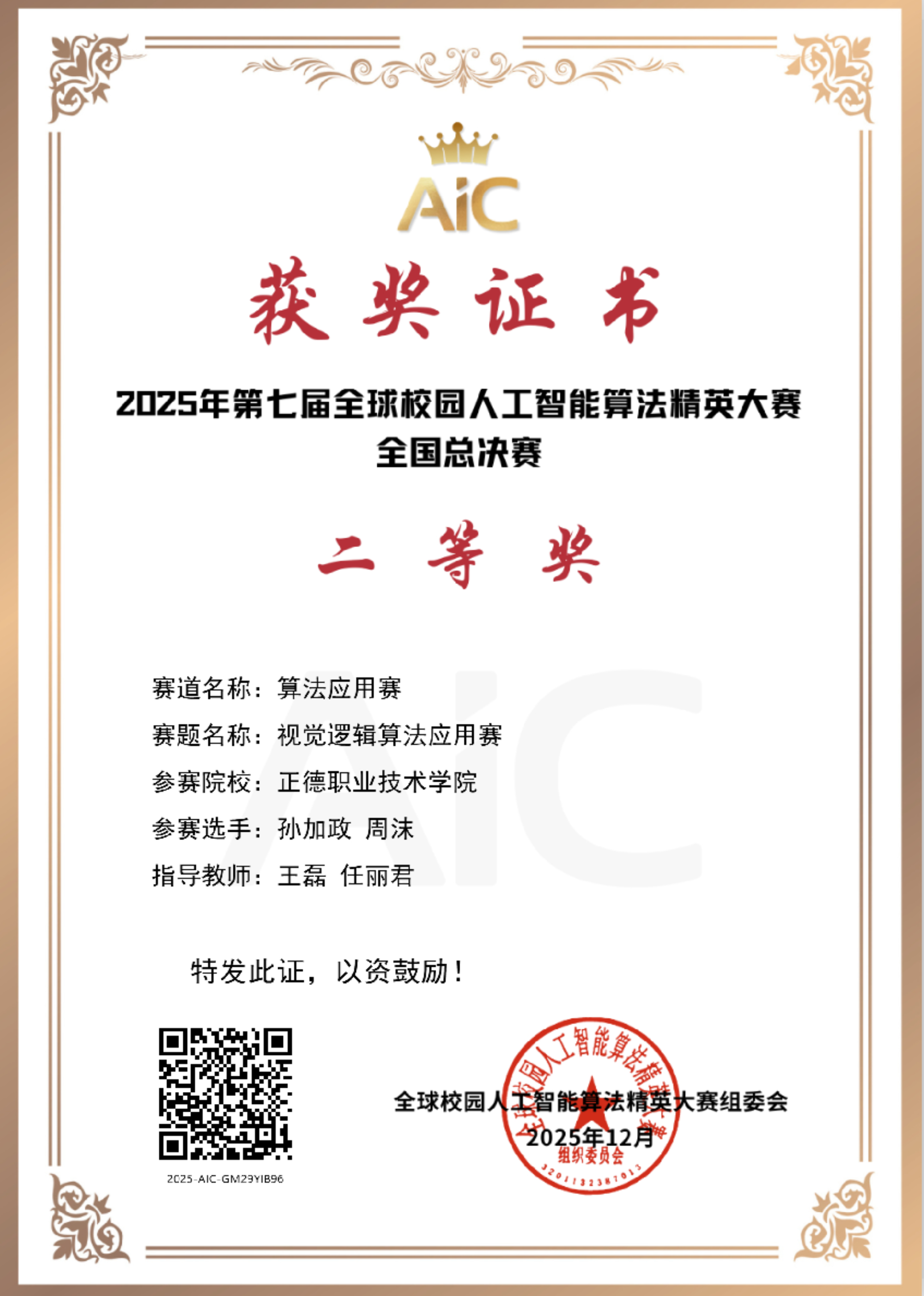 近日,第七届全球校园人工智能算法精英大赛全国总决赛在北京邮电大学圆满落幕,91自拍 首次参赛并斩获国奖。此赛事是列入“全国普通高等学校学科竞赛排行榜”的权威赛事,自2019年起已连续举办六届,第七届吸引全球961所院校、超1.8万支团队参赛,国内覆盖33个省级行政区,所有985高校均派出队伍参赛,竞争异常激烈。91自拍 汽车与机电工程系孙加政、周沫两位同学,在王磊、任丽君两位老师的悉心指导下,征战算法应用赛道“视觉逻辑算法应用赛”,该赛道汇聚了南京大学、东南大学、武汉大学等一众名校的400多支队伍参赛,91自拍 师生沉着应战、攻坚克难,凭借扎实的专业功底和创新算法设计脱颖而出,最终斩获国赛二等奖。