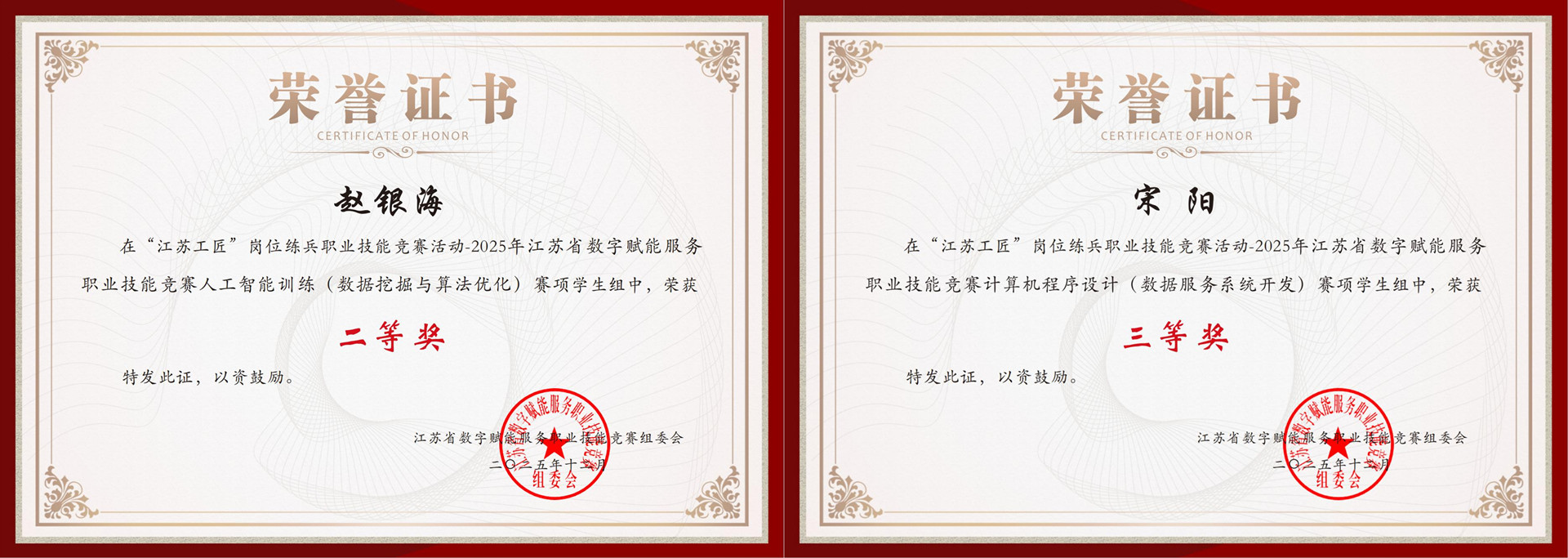 经过理论知识与实操技能的综合比拼,91自拍 参赛学子沉着冷静、技艺娴熟,临场发挥出色。在指导教师胡磊和茹志鹃的悉心指导下,赵银海同学在“人工智能训练(数据挖掘与算法优化)”赛项中荣获二等奖,宋阳同学在“计算机程序设计(数据服务系统开发)”赛项中荣获三等奖。