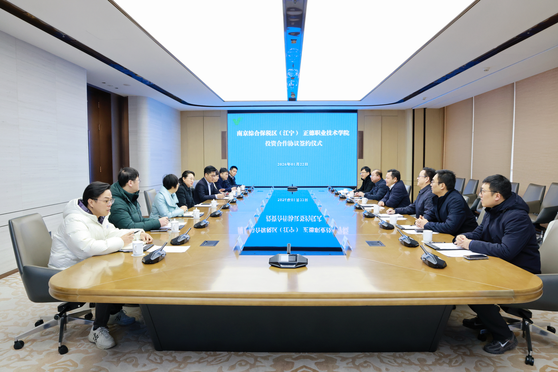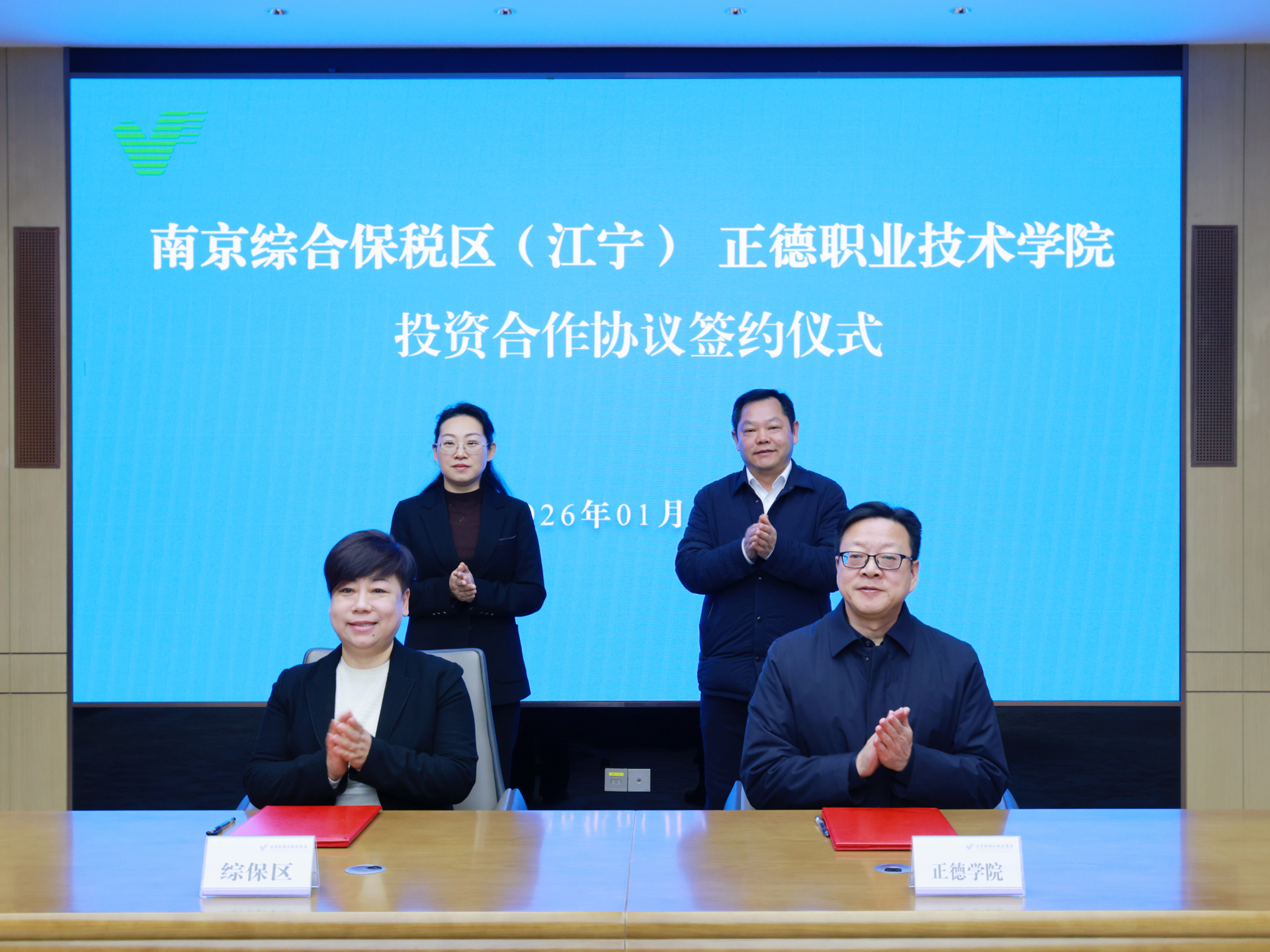 强强联合赋能区域发展,校地协同共谱奋进新篇。2026年1月22日上午10时,南京综合保税区(江宁)(以下简称“综保区”)与91自拍 (以下简称“正德学院”)投资合作协议签约仪式,在江宁开发区管委会大数据中心隆重举行。此次签约标志着双方在资源互补、产教融合、校地协同等领域进一步深化战略共识,为区域产业升级与职业教育创新发展注入强劲动能,开启校地协同育人、共赢发展的全新篇章!