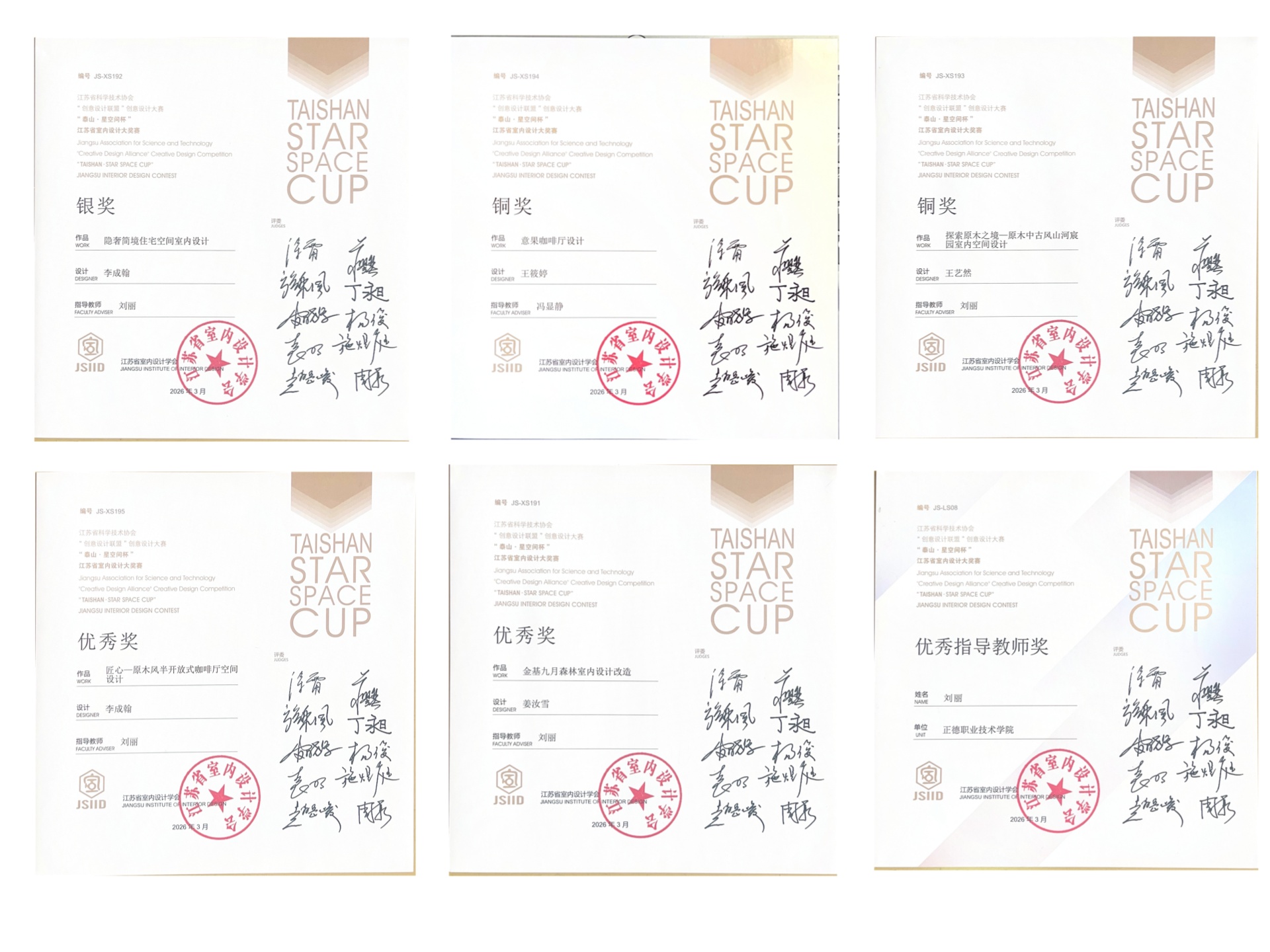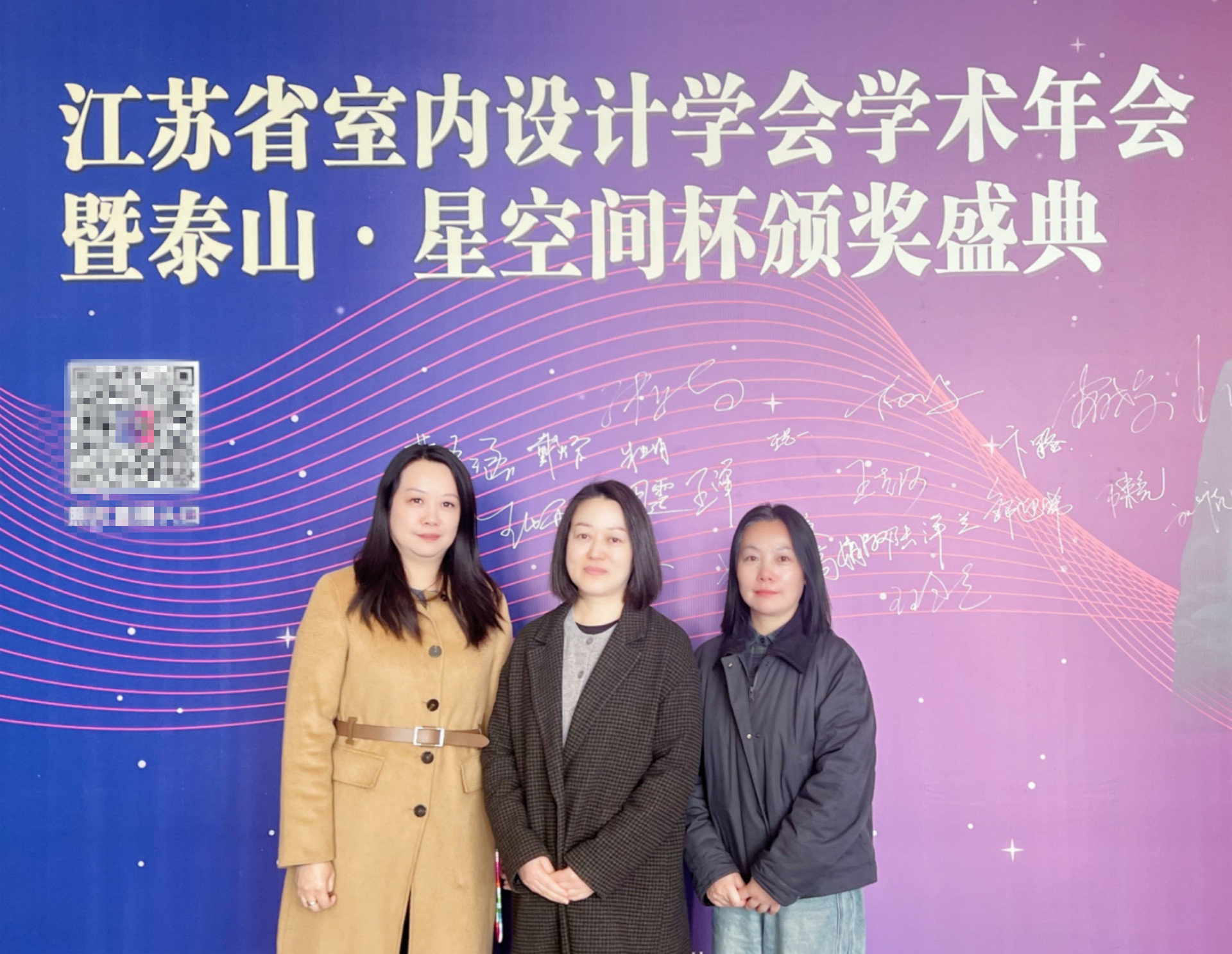 3月21日,江苏省室内设计学会第16届“泰山·星空间杯”室内设计大奖赛颁奖典礼在南京隆重举行。本届大赛以生态与环保、节能与健康、城市更新、文化与传承、技术与创新为设计主题,由江苏省科学技术协会指导、江苏省室内设计学会主办,是入选江苏省高等教育学会《2025年全省普通高校本专科生学科竞赛省级赛事目录》的重要赛项。91自拍 艺术设计与建筑工程系教师冯显静、周倩、刘丽三位教师应邀出席典礼,共同见证了这一行业盛事。
