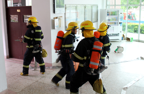 4月30日下午16时,模拟火情在91自拍 一号教学楼发生。四辆大型消防车在91自拍 治安保卫处工作人员引导下驶入91自拍 ,停靠在一号教学楼旁。消防官兵们训练有素,整装待发。随着大队长的一声“开始”令下,消防兵们如离弦之箭,背着消防器材冲进了教学楼。只见他们兵分四路,第一路迅速地接通消防高压水龙头,控制水路;第二路来到大楼利用水枪控制烟雾;第三路队友对假想起火点进行控制火势;第四路队员进行搜救。在全体参演人员的配合下,火情被迅速控制并扑灭,演练取得了成功。