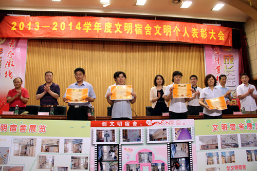 大会向获得各项荣誉的代表先后颁发了奖状和荣誉证书。先进个人代表、辅导员代表、先进公寓代表分别作了典型发言。院学生自我管理委员会主席宣读了《2014—2015学年文明宿舍倡议书》。