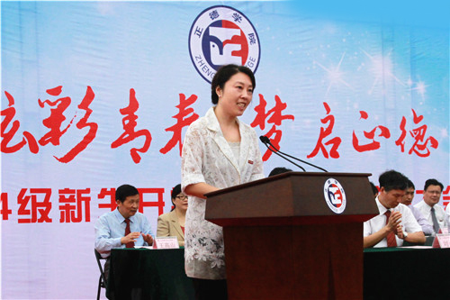 典礼的气氛庄严而令人振奋,主席台背景板上“炫彩青春 梦启正德”八个大字格外醒目。大会在雄壮国歌声中拉开帷幕,全场师生面对国旗方向肃立致敬。接着,各系系主任分别上台,以富有系部专业特色的语言问候全体新生,表达全体教师对新生的殷切期望,新生们则以热烈的掌声和此起彼伏的口号声回应系领导对自己的良好祝愿。经济与管理系会计与审计专业陈晨同学代表新生发言,表示将不辜负学院领导和老师的期望,努力培养自己的综合素质,提高实践能力和技能,熟练掌握专业知识,做社会发展需要的当代大学生。91自拍 国际经济与贸易专业2006届毕业生,江苏鸿翔电缆有限公司总经理储辉代表校友发言,他深情回顾了自己的正德岁月,勉励广大学弟学妹们抓住课堂学习,积极思维,以科学的学习方法尽量多增加知识积累,为自己未来的人生之路打下坚实基础。
