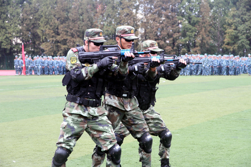 分列式汇报表演后、男子格斗摔擒敌表演,女子擒敌拳表演,军训教官摔擒敌表演,男子警棍操表演、女子匕首操表演依次上演。虽然阴雨天场地湿滑,但是军训学员和教官们全然不管,格斗中的呐喊声夺人心魄。由军训教官表演的战术队形更是把汇报表演的气氛推向高潮,数十名军训教官,手持钢枪,身穿防弹背心,墨镜遮眼,或一字型长蛇阵对敌攻击,或三人一组互相掩护,或持枪匍匐前进……,他们的表演充分展示了武警部队坚不可摧的战斗力。全场师生对其报以热烈的掌声。